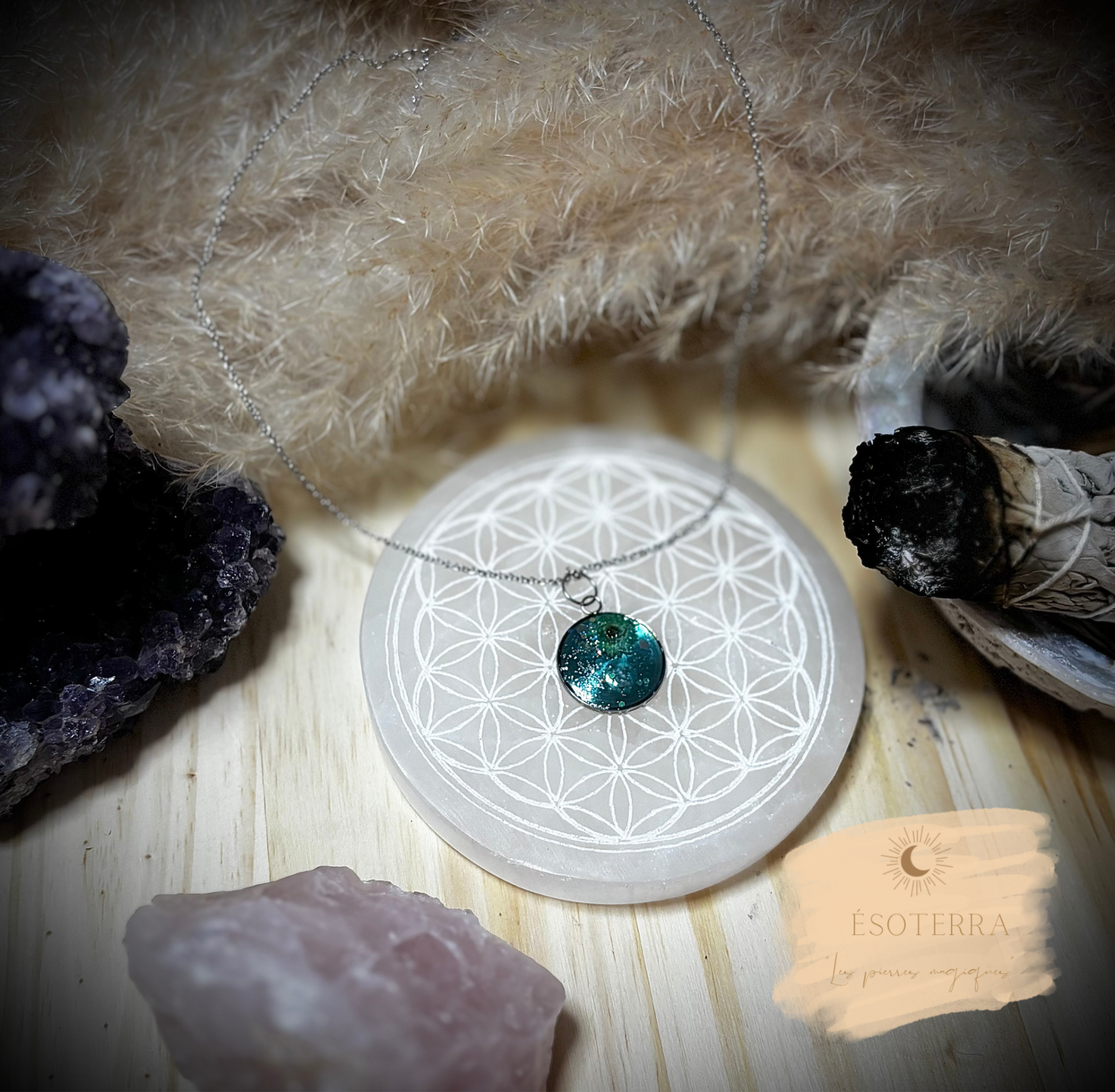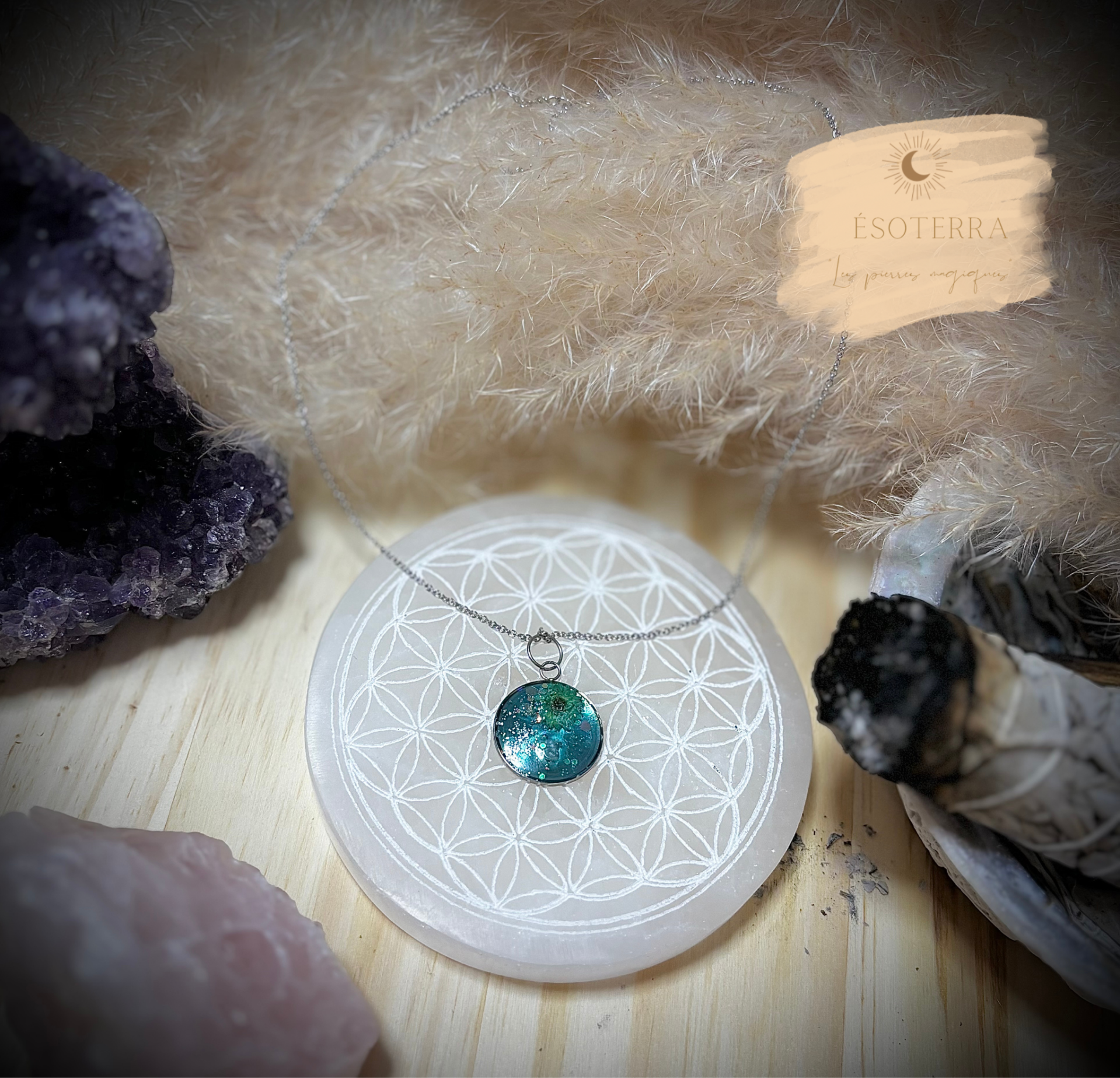 Pendentif fait main en résine Epoxy avec chaîne couleur Argent en Acier inoxydable.