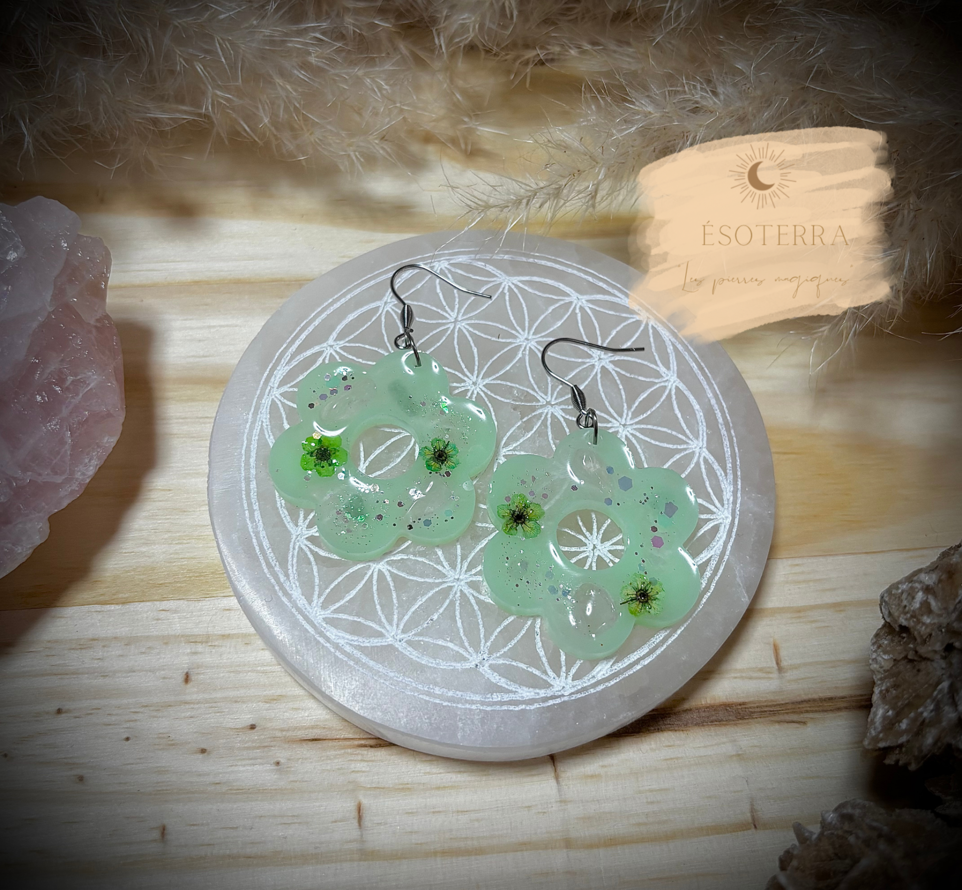 Boucles d'oreilles Fleurs, fait main en résine Epoxy couleur Argenté en Acier inoxydable.