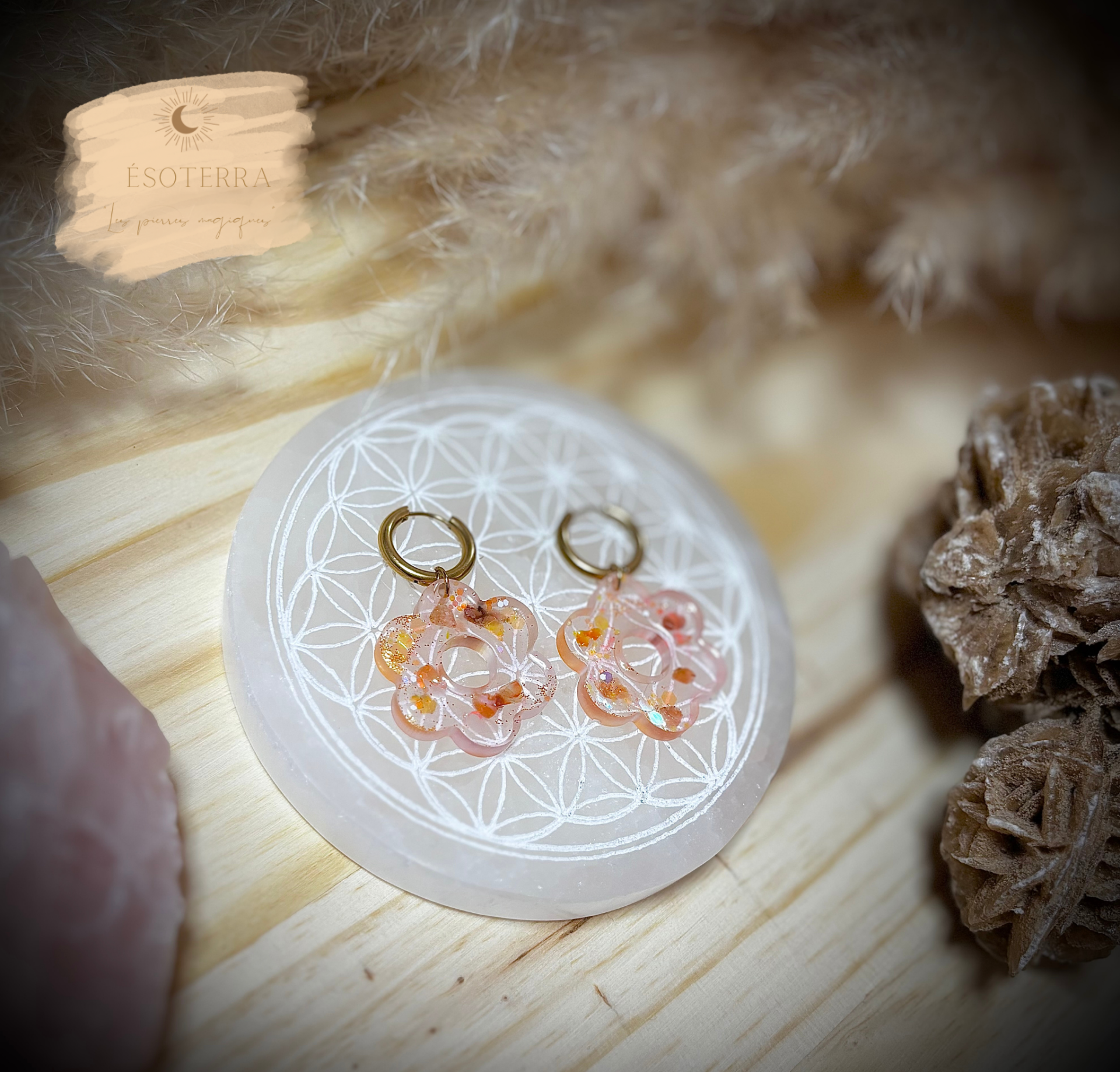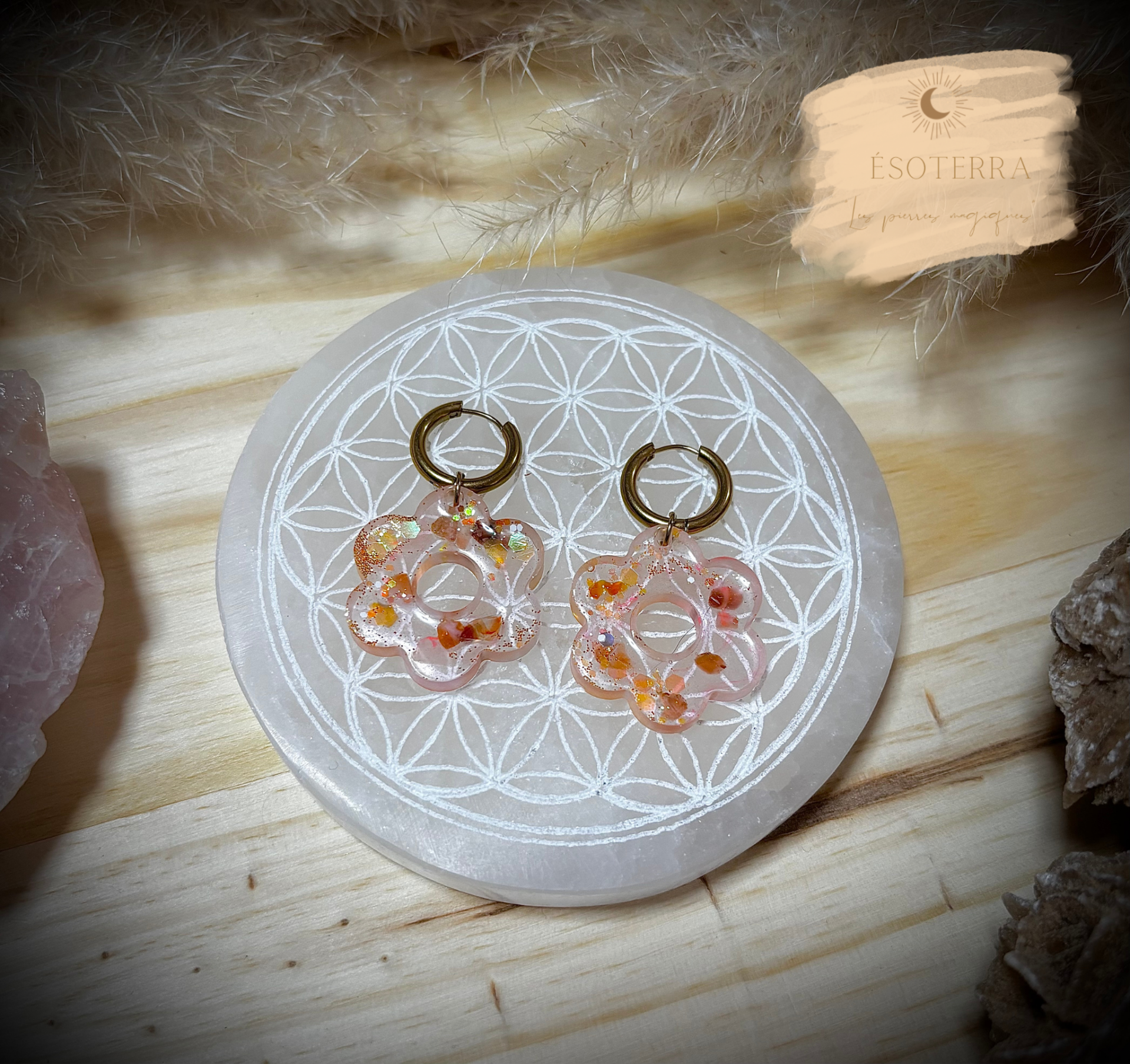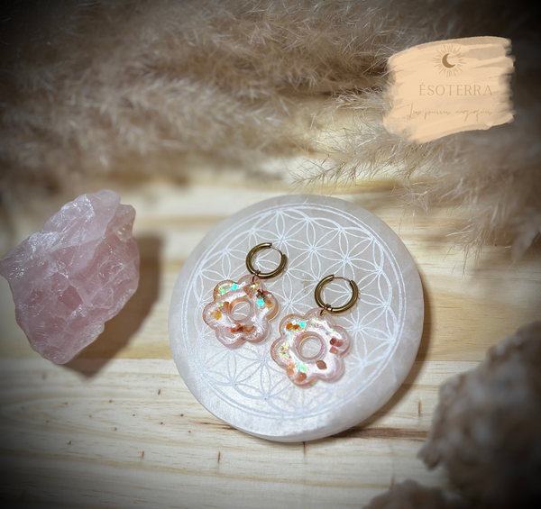 Boucles d'oreilles Fleurs, fait main en résine Epoxy avec créoles couleur Doré en Acier inoxydable.