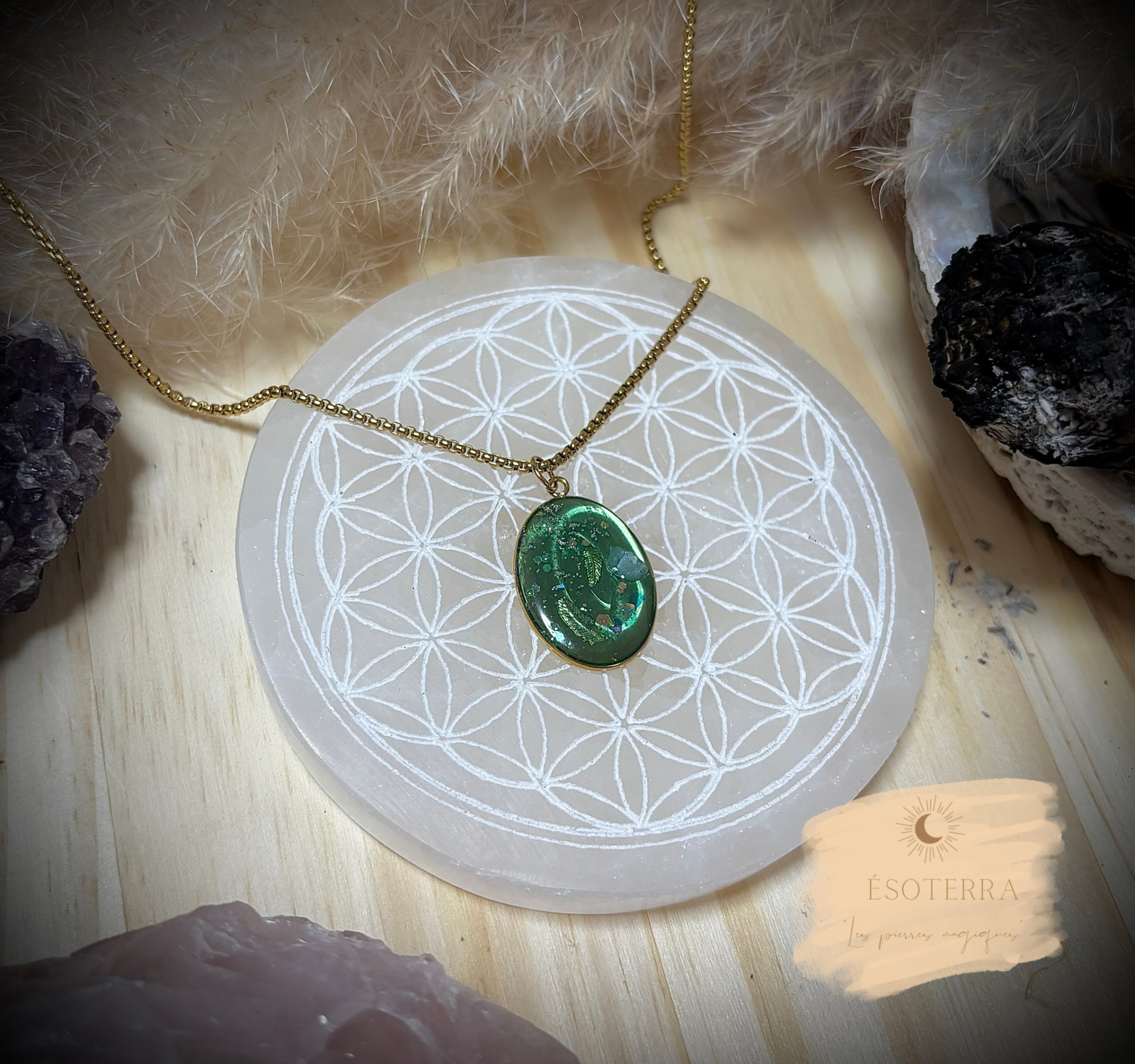 Pendentif fait main en résine Epoxy avec chaîne couleur Doré en Acier inoxydable.