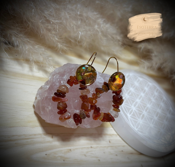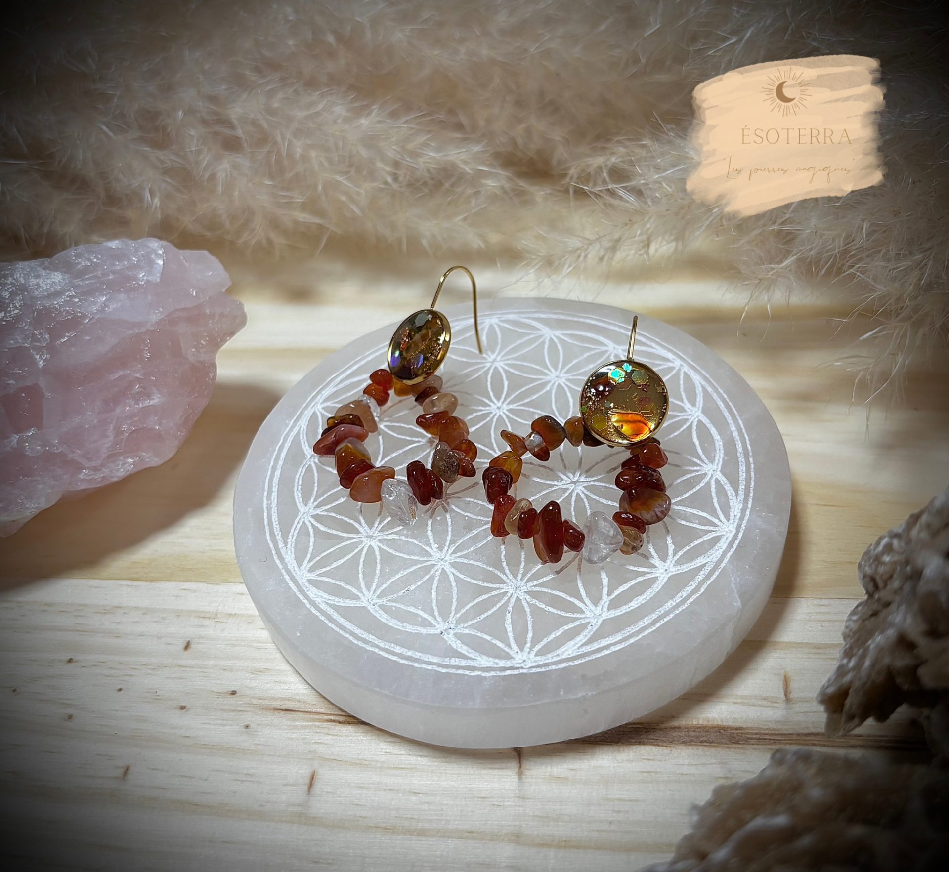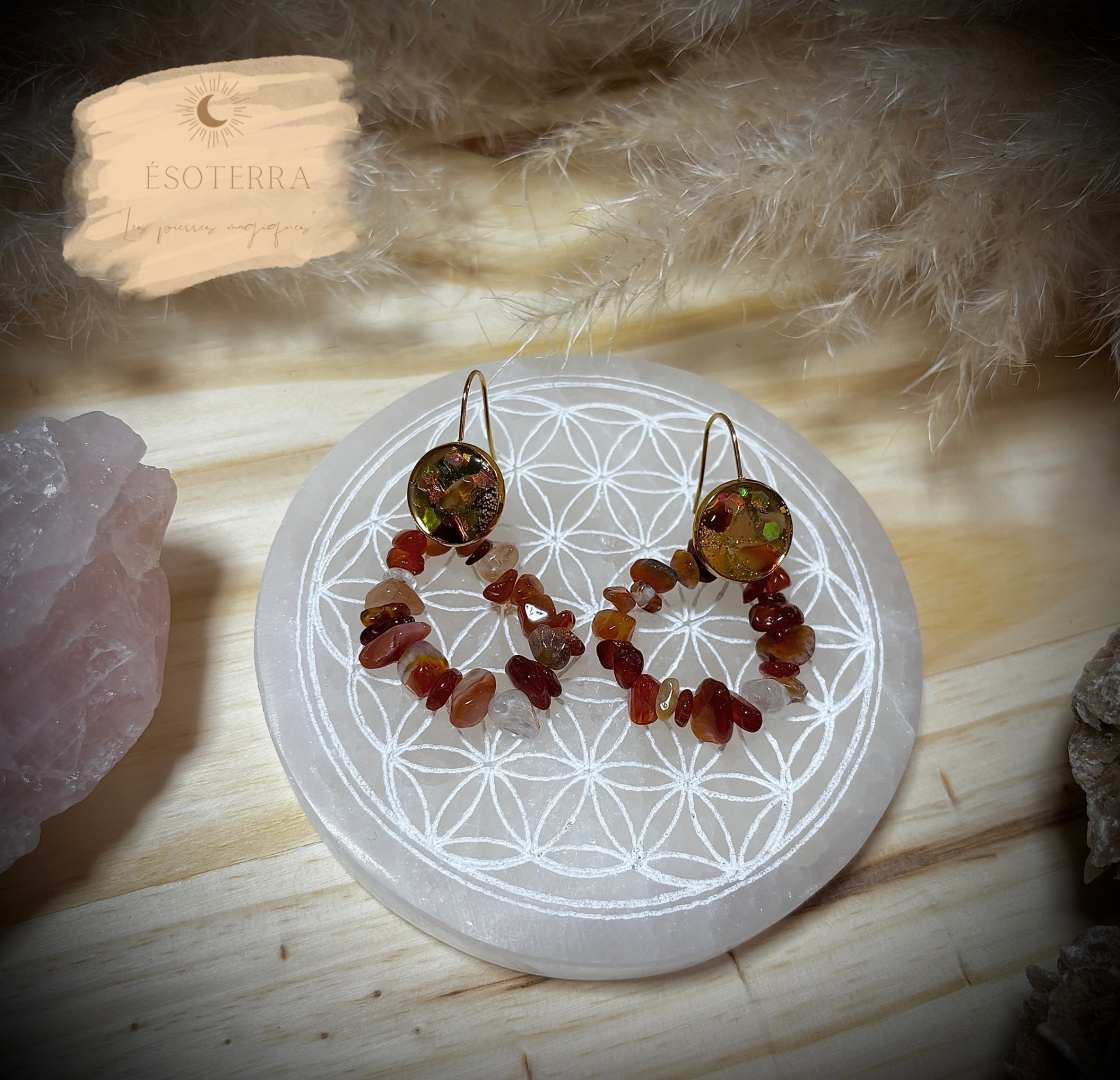 Dans LE BIJOU, vous y trouverez une ou des pierres de "Cornaline", des paillettes, une couleur translucide, des fleurs séchées ou objets miniatures si la place le permet, tout cela associés au chakra correspondant au bijou.