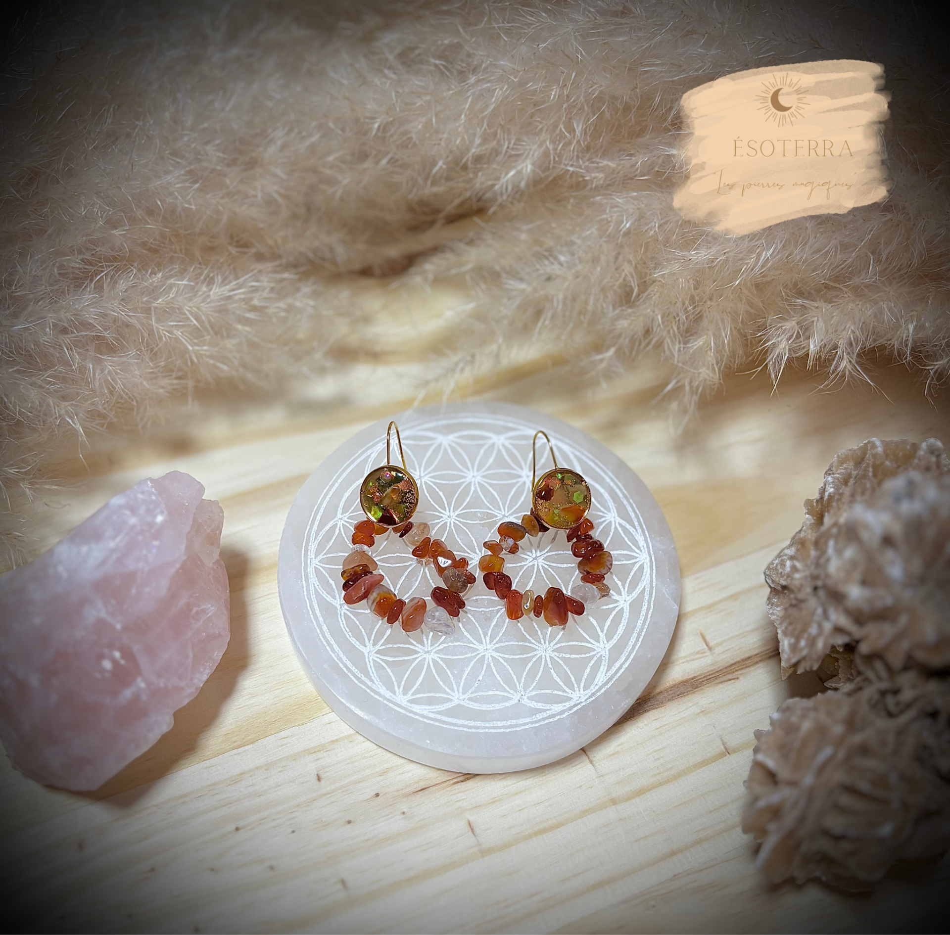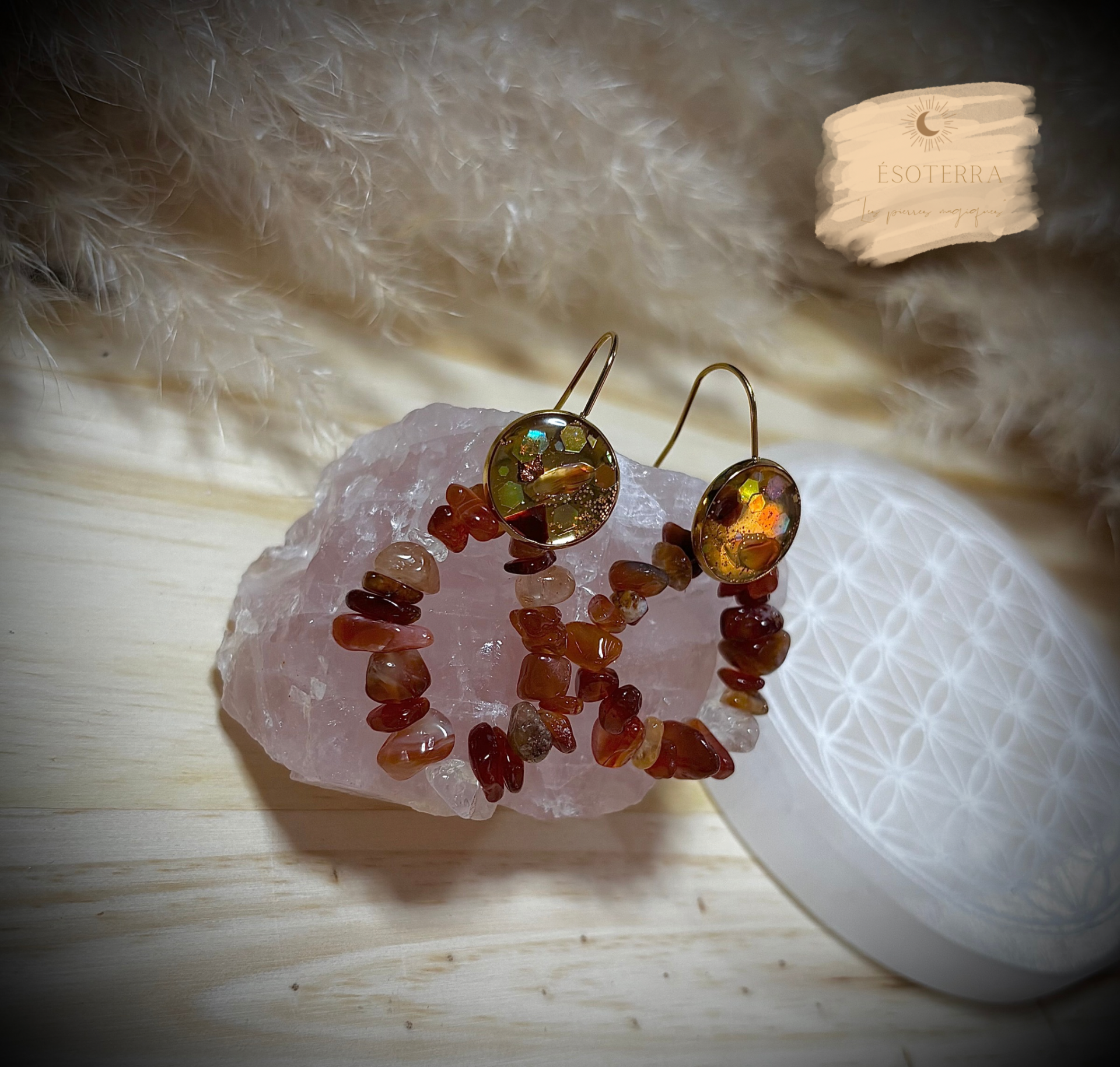 Boucles d'oreilles fait main en résine Epoxy couleur Doré en Acier inoxydable avec pierres.