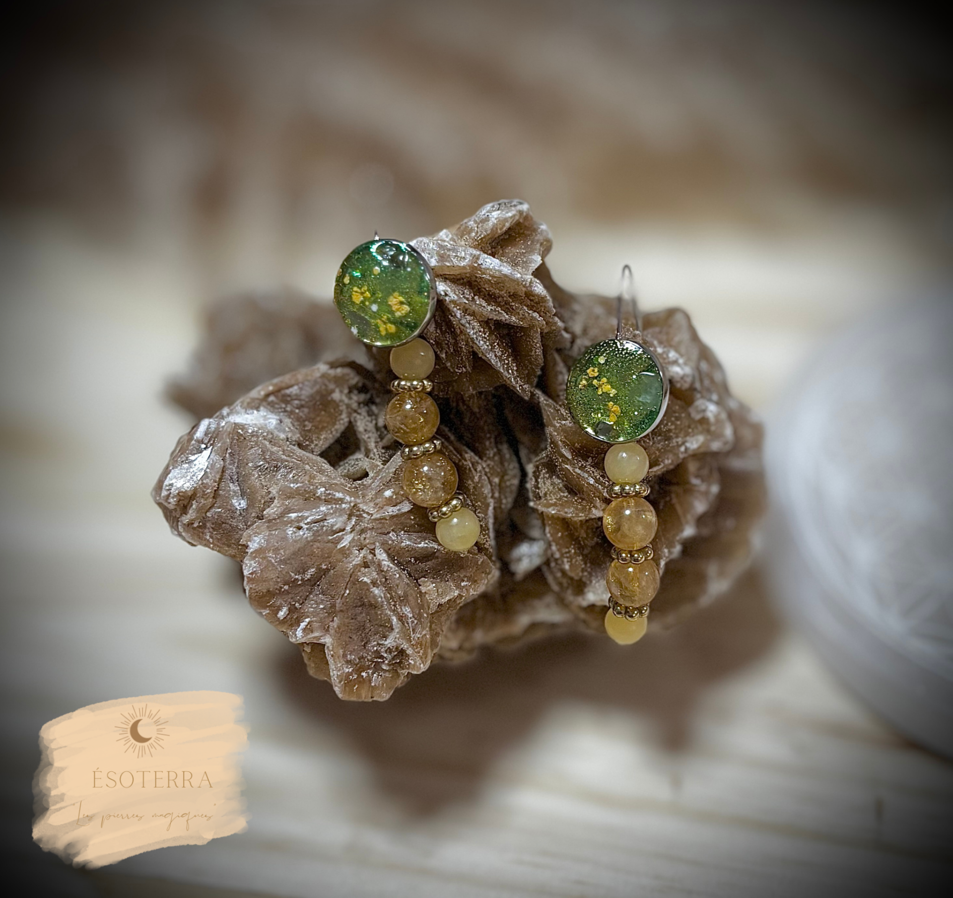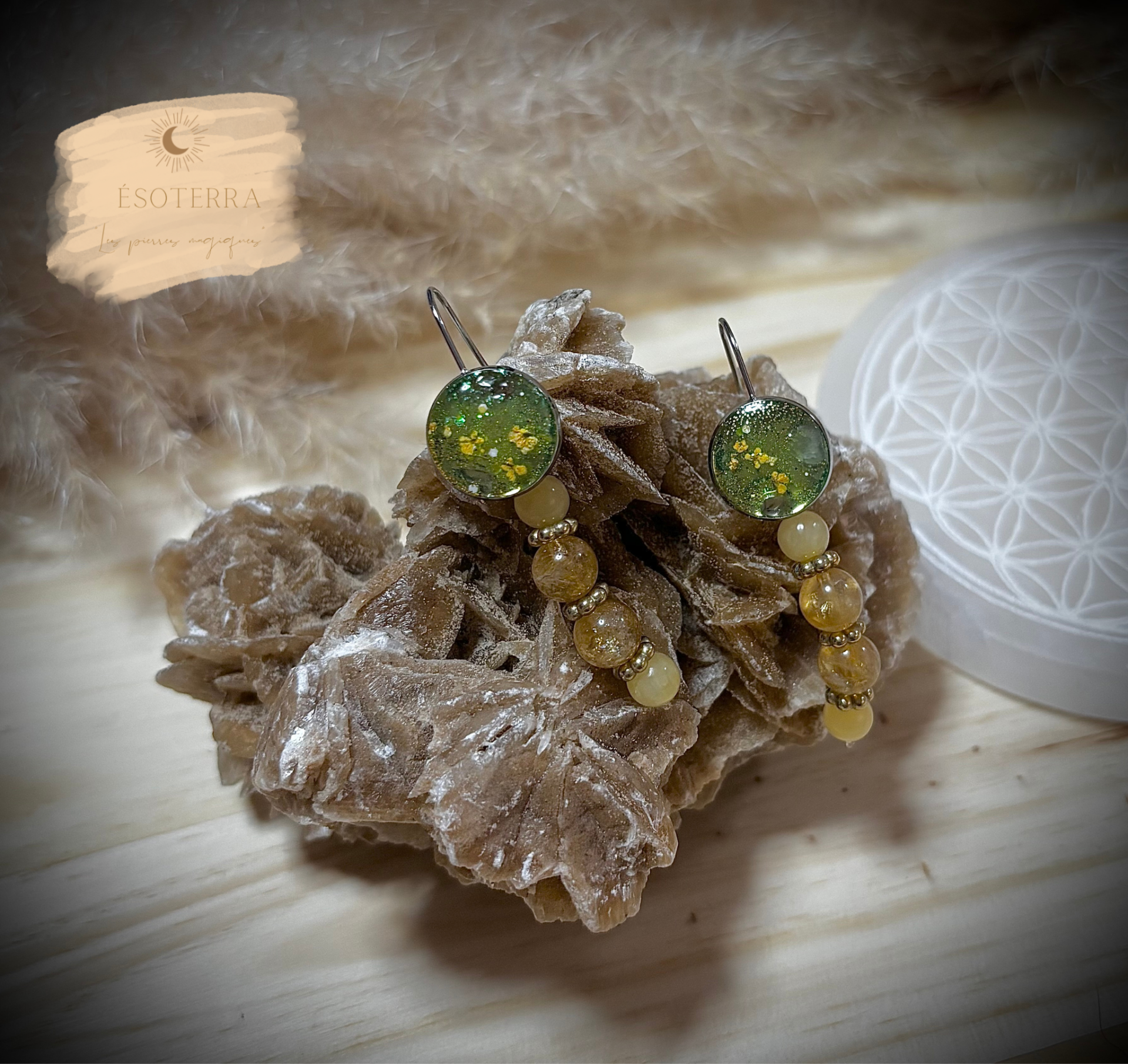 Boucles d'oreilles fait main en résine Epoxy couleur Argent en acier inoxydable avec des pierres de Citrine Jaune & des pierres de Soleil.