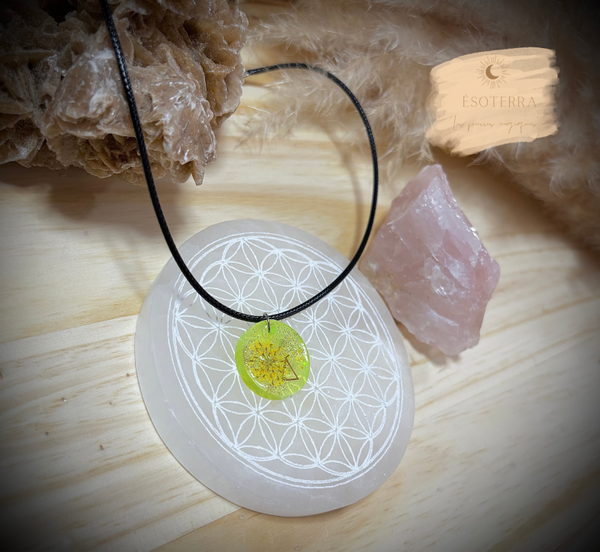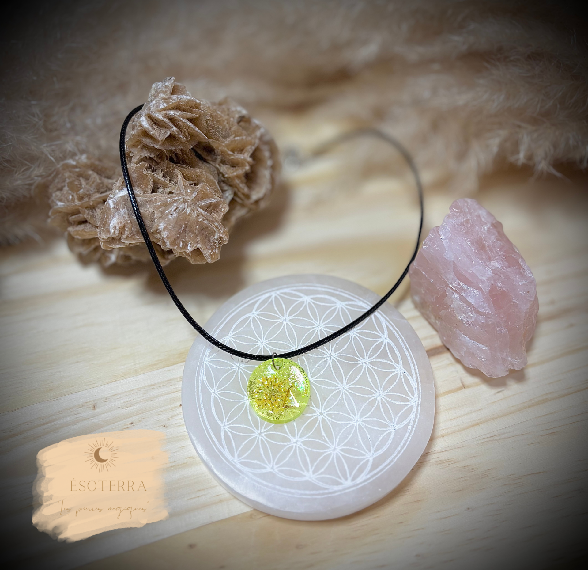 Dans LE BIJOU, vous y trouverez une ou des pierres de "Citrine jaune", des paillettes, une couleur translucide, des fleurs séchées ou objets miniatures si la place le permet, tout cela associés au chakra correspondant au bijou.