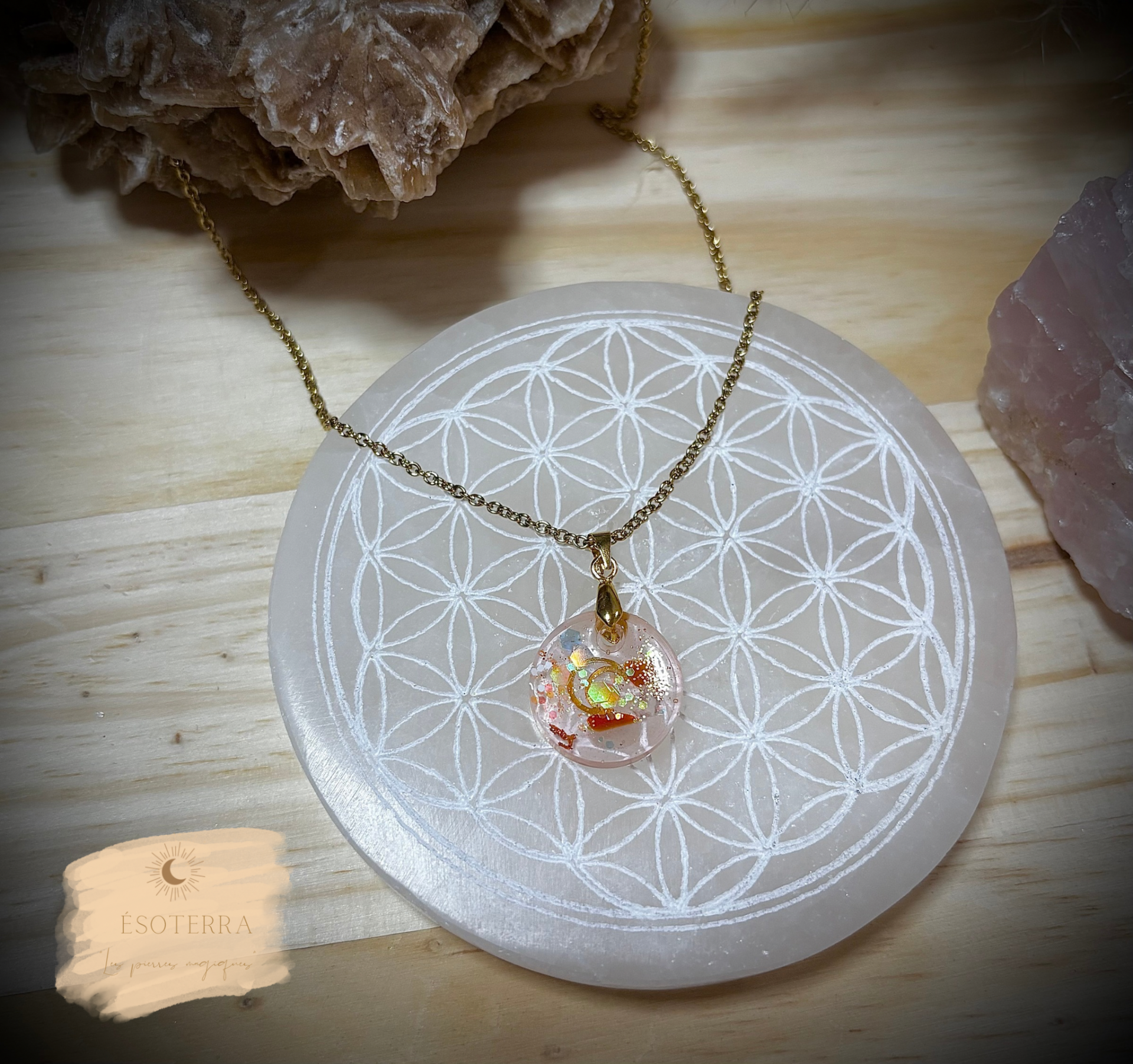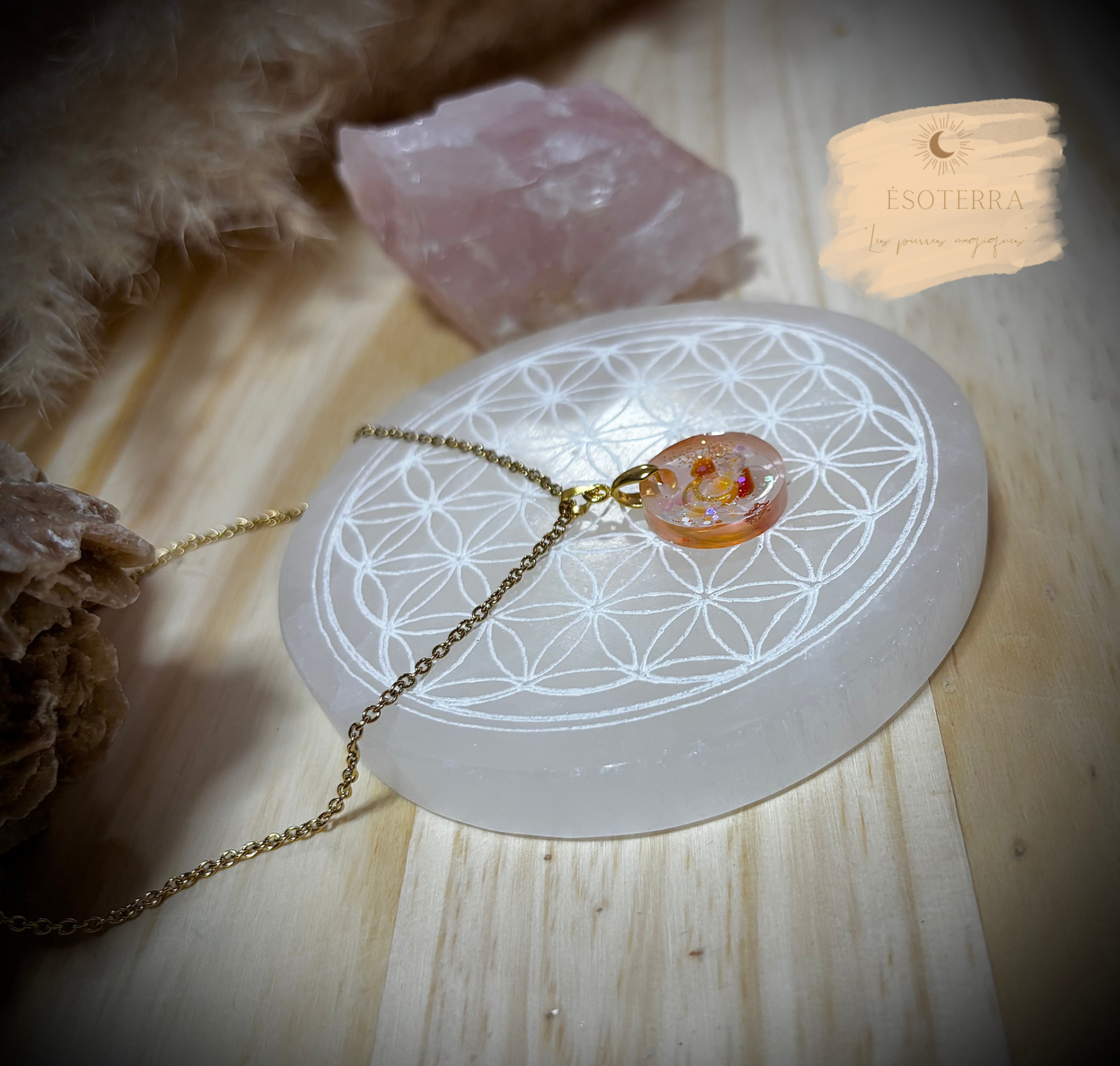 Dans LE BIJOU, vous y trouverez une ou des pierres de "Cornaline", des paillettes, une couleur translucide, des fleurs séchées ou objets miniatures si la place le permet, tout cela associés au chakra correspondant au bijou.