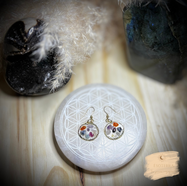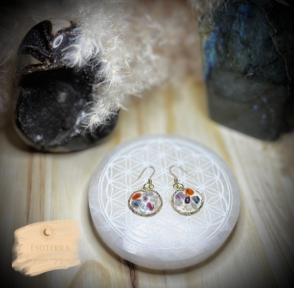 Boucles d'oreilles fait main en résine Epoxy couleur Doré en acier inoxydable, incluant 7 pierres correspondantes à tous les chakras.