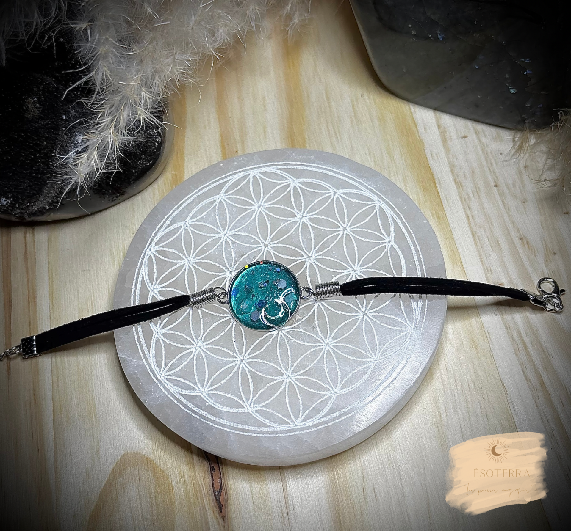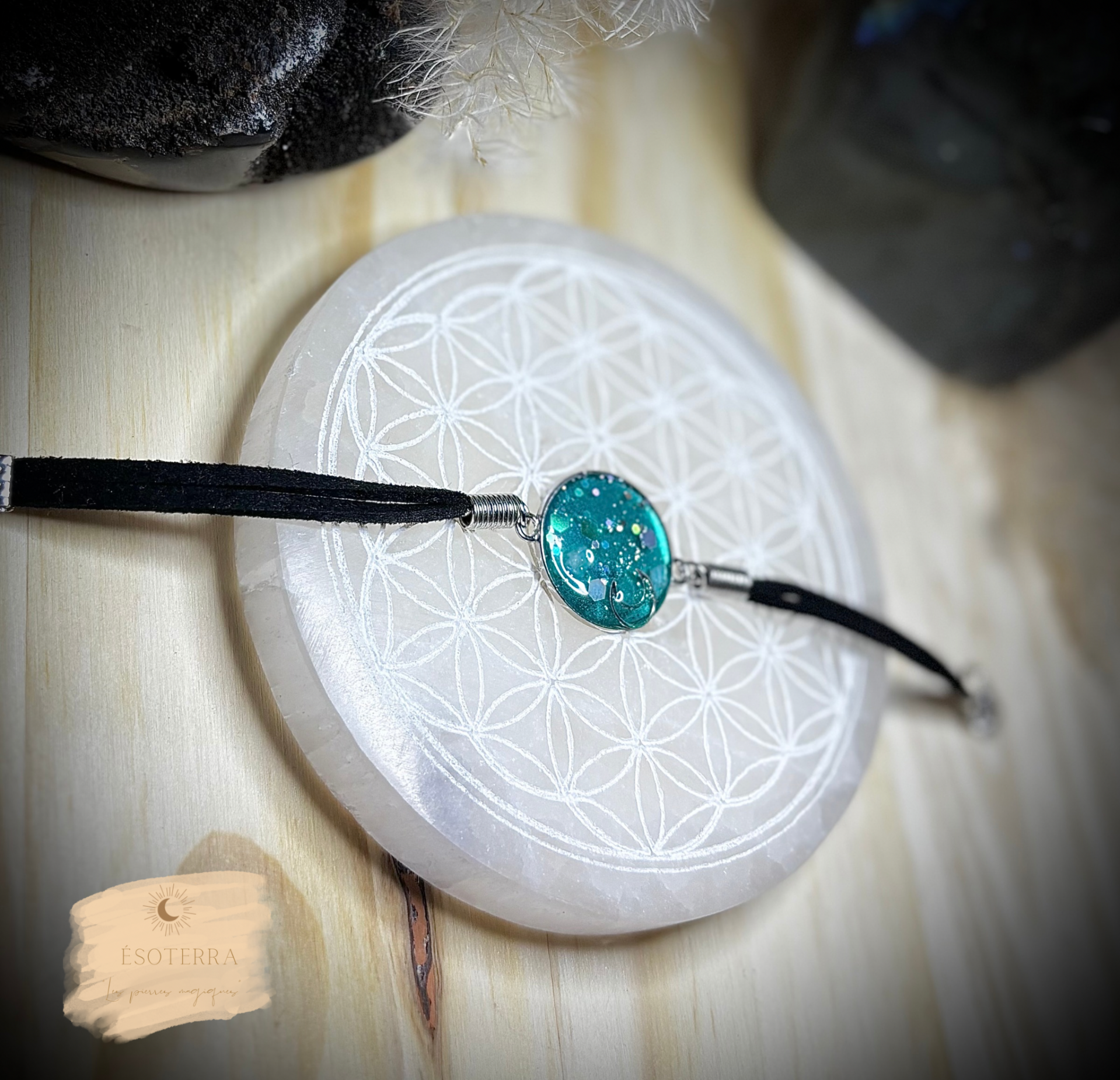 Dans LE BIJOU, vous y trouverez des pierres ( Aigue-Marine &/ou Amazonite ), des paillettes, une couleur translucide, des fleurs séchées ou objets miniatures si la place le permet, tout cela associés au chakra correspondant au bijou.
