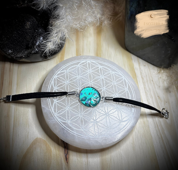 Bracelet fait main en résine Epoxy couleur Argenté en Acier inoxydable avec cordon noir en cuir.