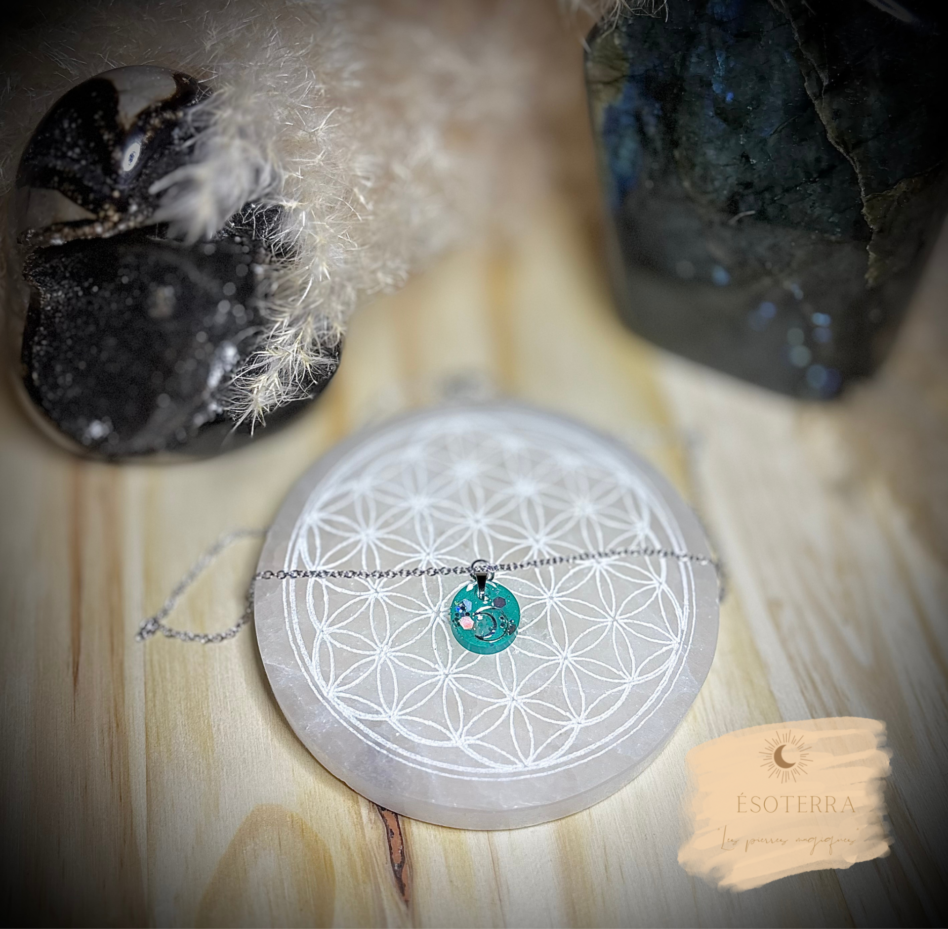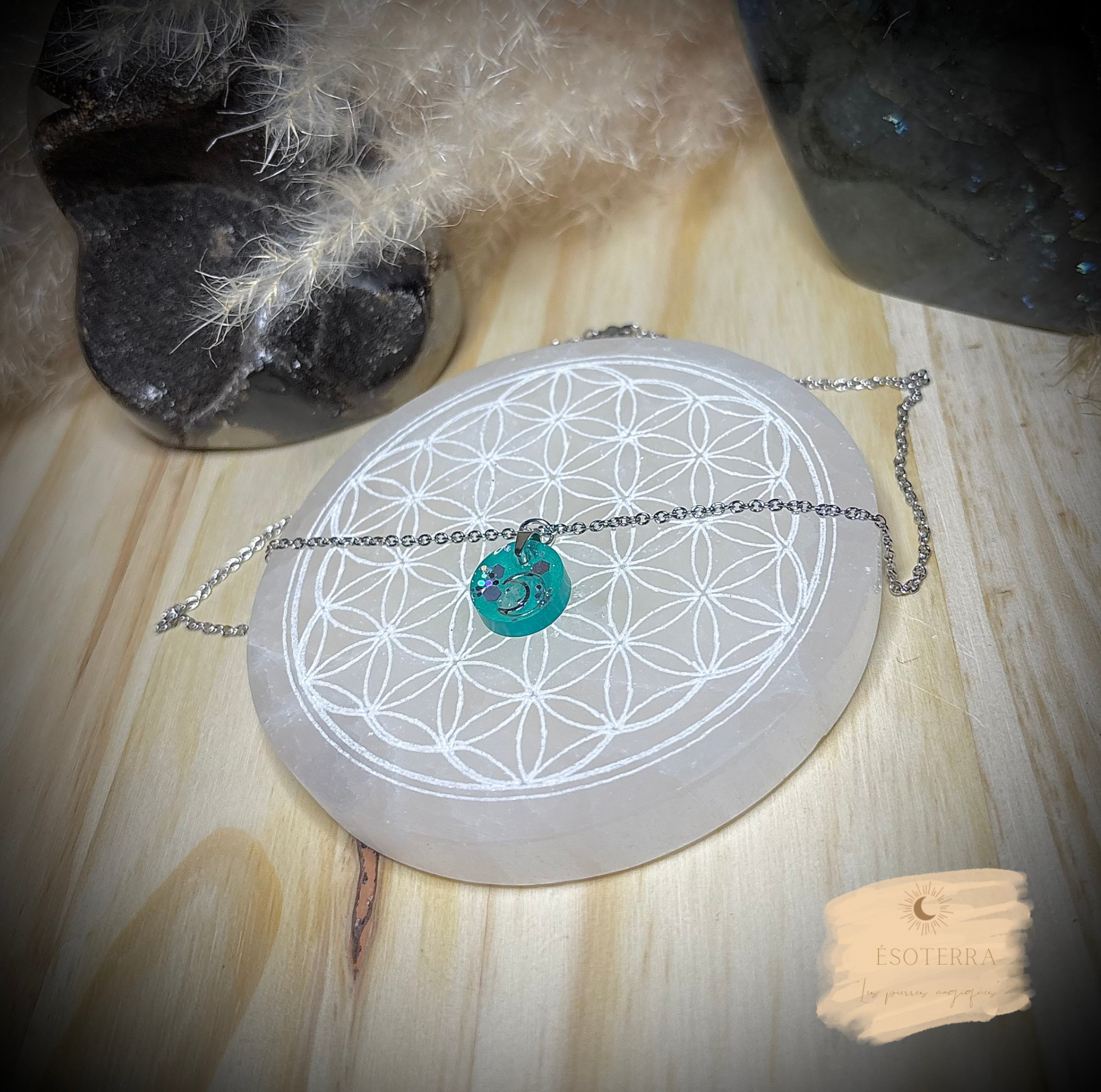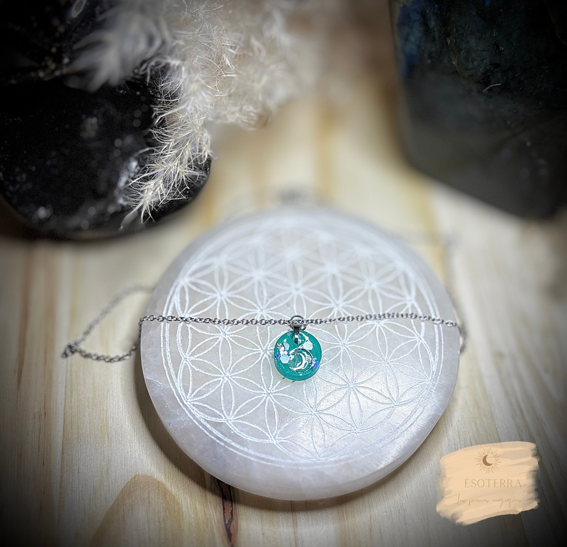 Pendentif fait main en résine Epoxy avec chaîne couleur Argenté en Acier inoxydable.