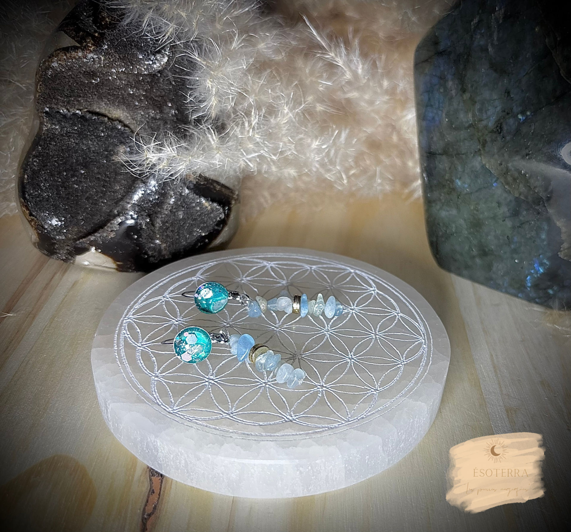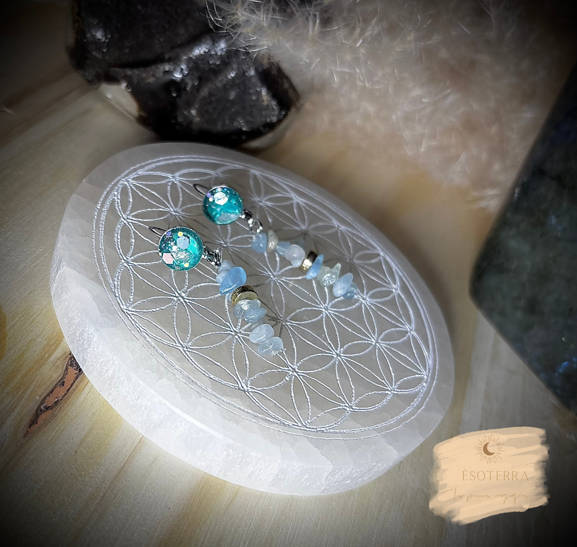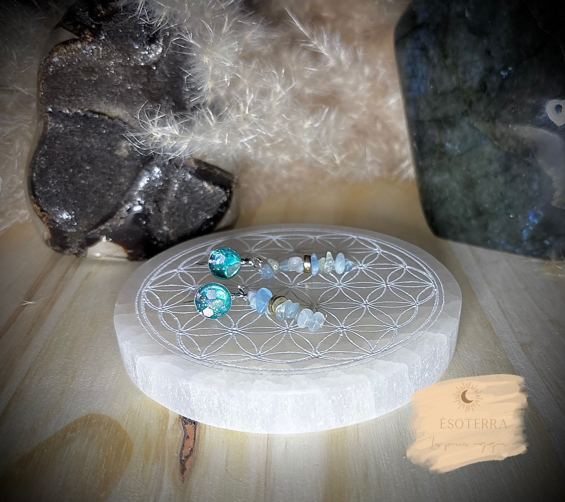 Dans LE BIJOU, vous y trouverez des pierres ( Aigue-Marine &/ou Amazonite ), des paillettes, une couleur translucide, des fleurs séchées ou objets miniatures si la place le permet, tout cela associés au chakra correspondant au bijou.