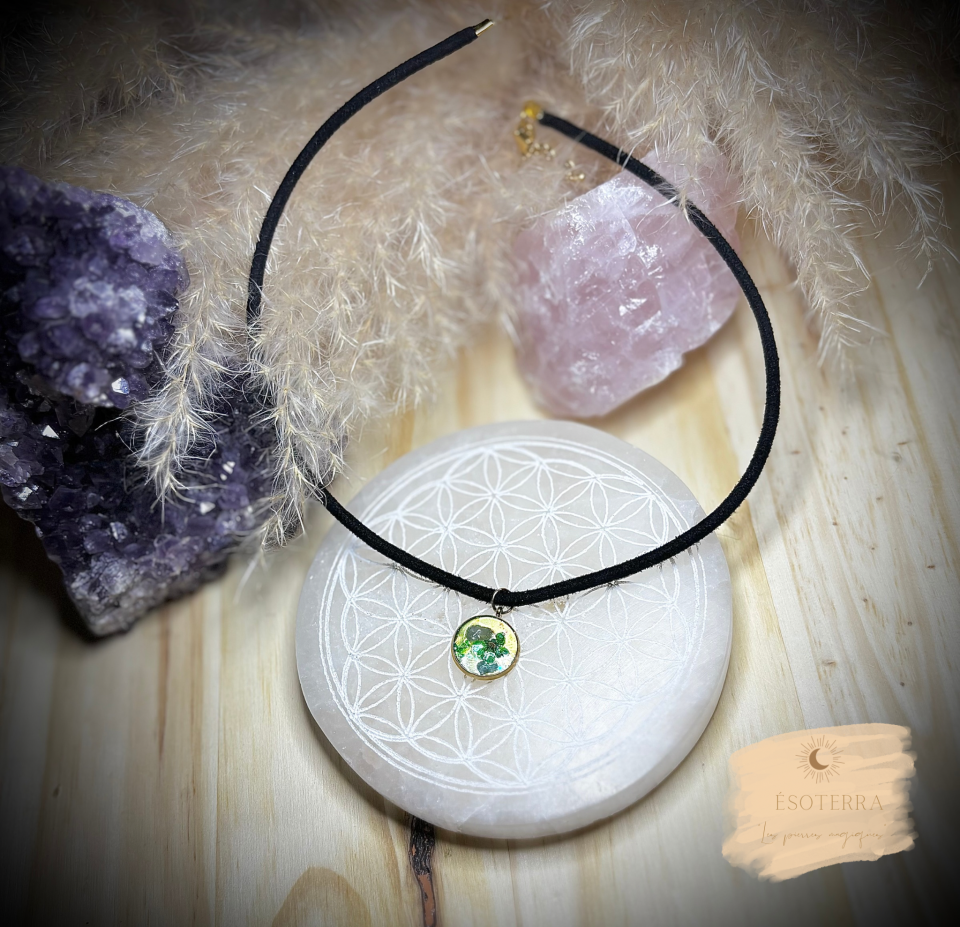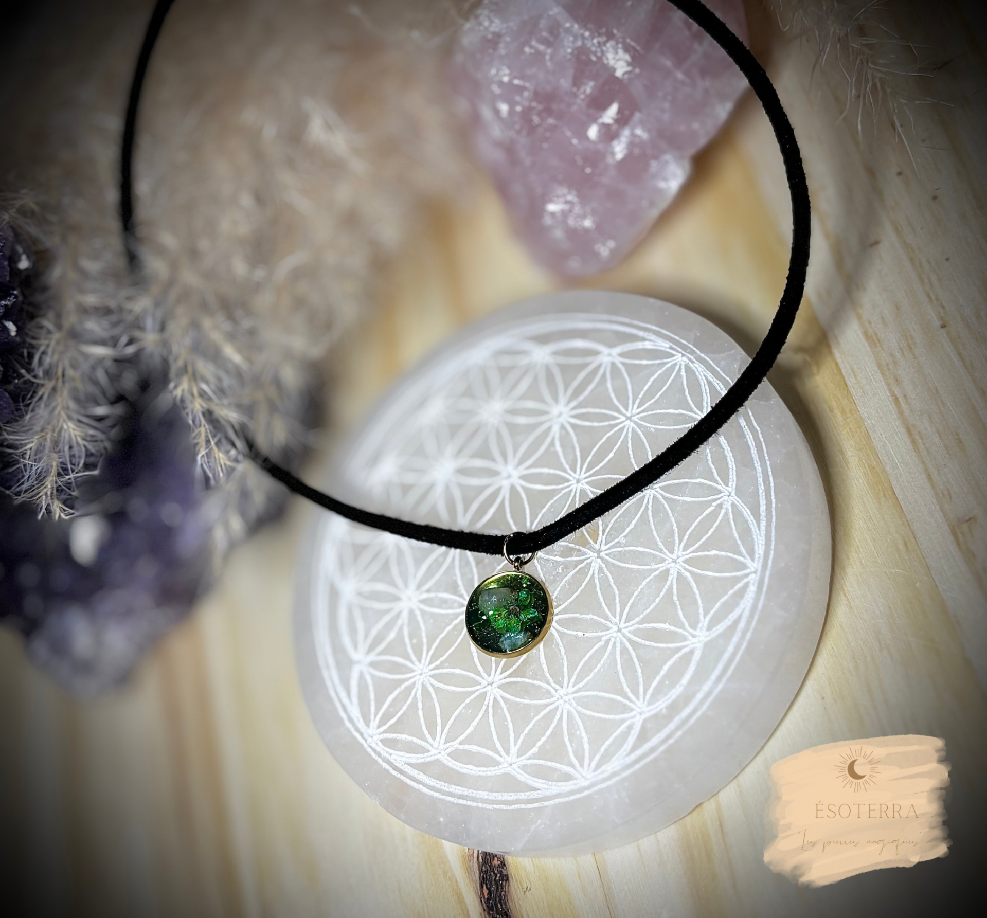 Pendentif fait main en résine Epoxy couleur Doré en Acier inoxydable. Avec cordon en cuir noir, ras du cou.