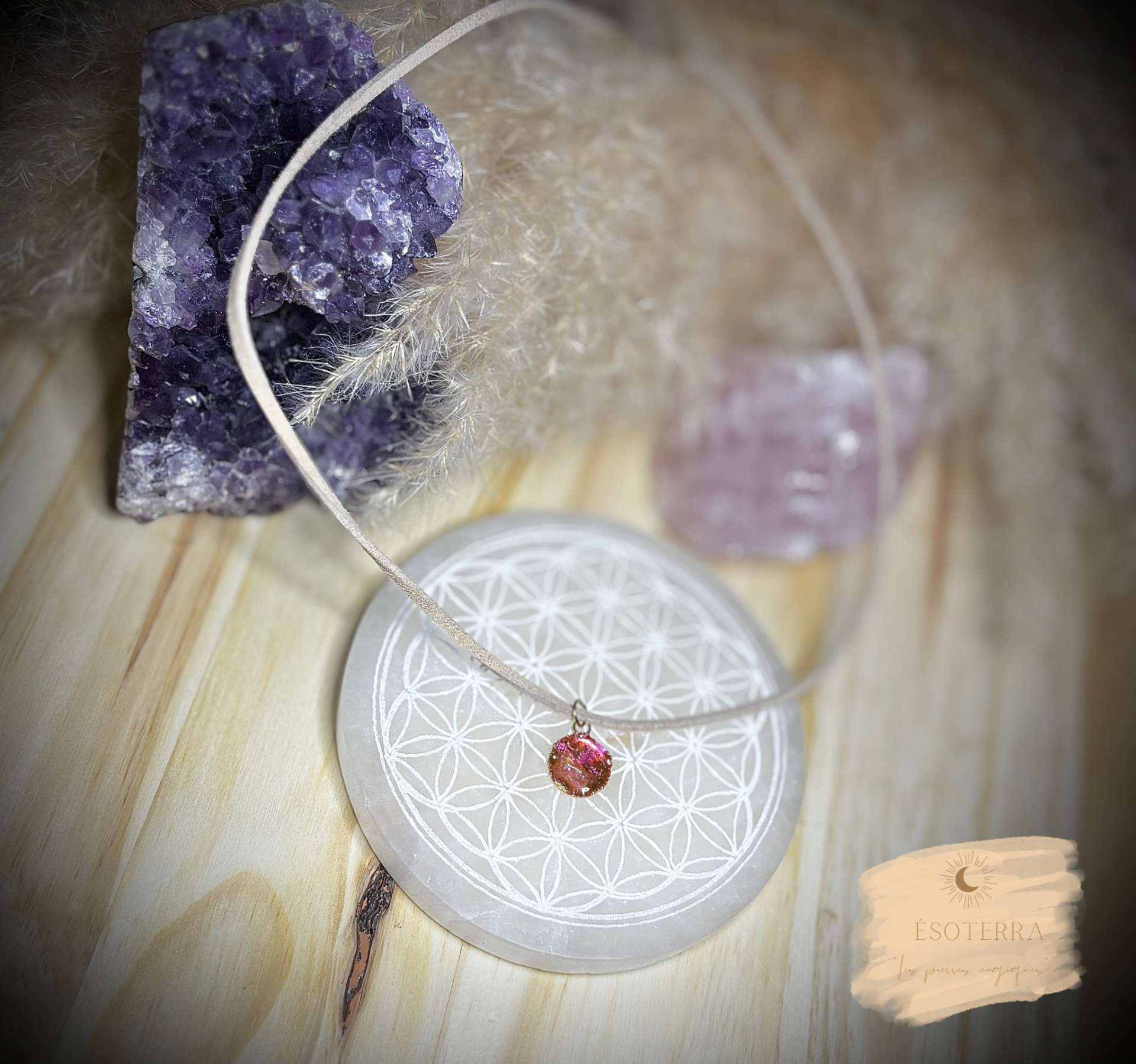 Dans LE BIJOU, vous y trouverez des pierres ( Quartz rose, rhodonite &/ou Aventurine verte ), des paillettes, une couleur translucide, des fleurs séchées ou objets miniatures si la place le permet, tout cela associés au chakra correspondant au bijou.