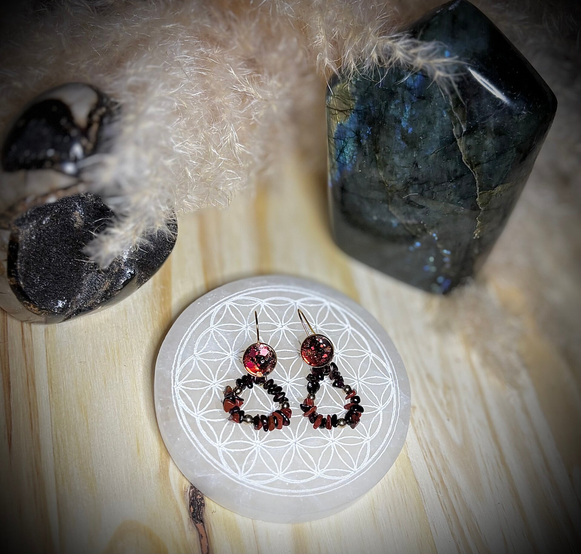 Boucles d'oreilles fait main en résine Epoxy couleur Doré en Acier inoxydable avec pierres de Jaspe rouge &/ou de Grenat rouge.