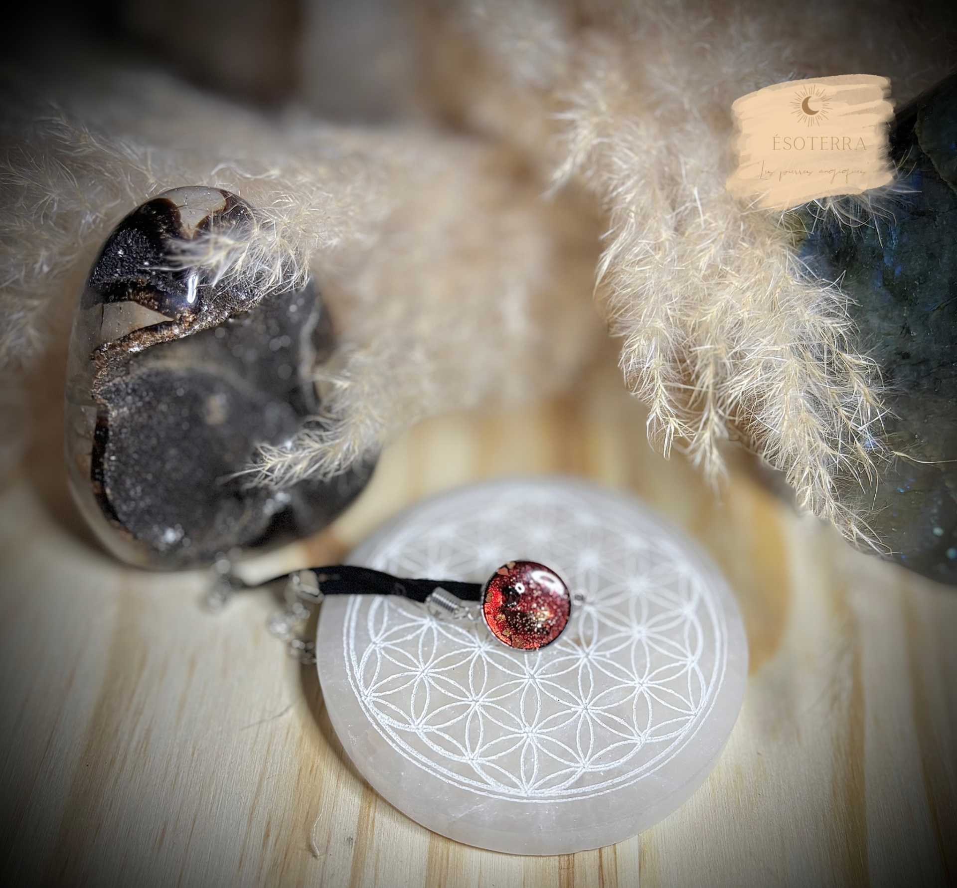 Dans LE BIJOU, vous y trouverez une ou plusieurs pierres de "Jaspe rouge" &/ou de "Grenat rouge", des paillettes, une couleur translucide, des fleurs séchées ou des objets miniatures si la place le permet, tout cela associés au chakra correspondant au bijou.