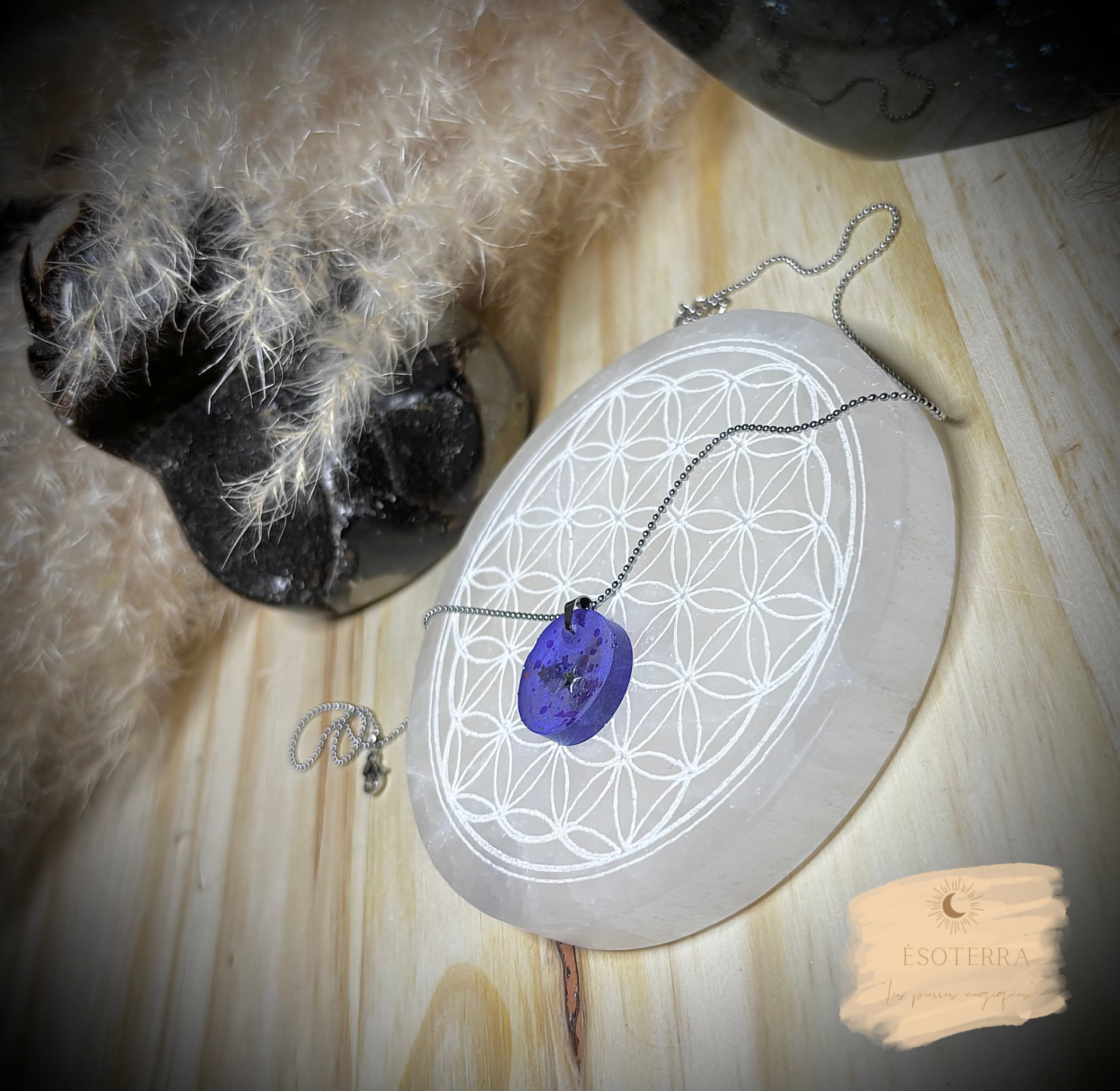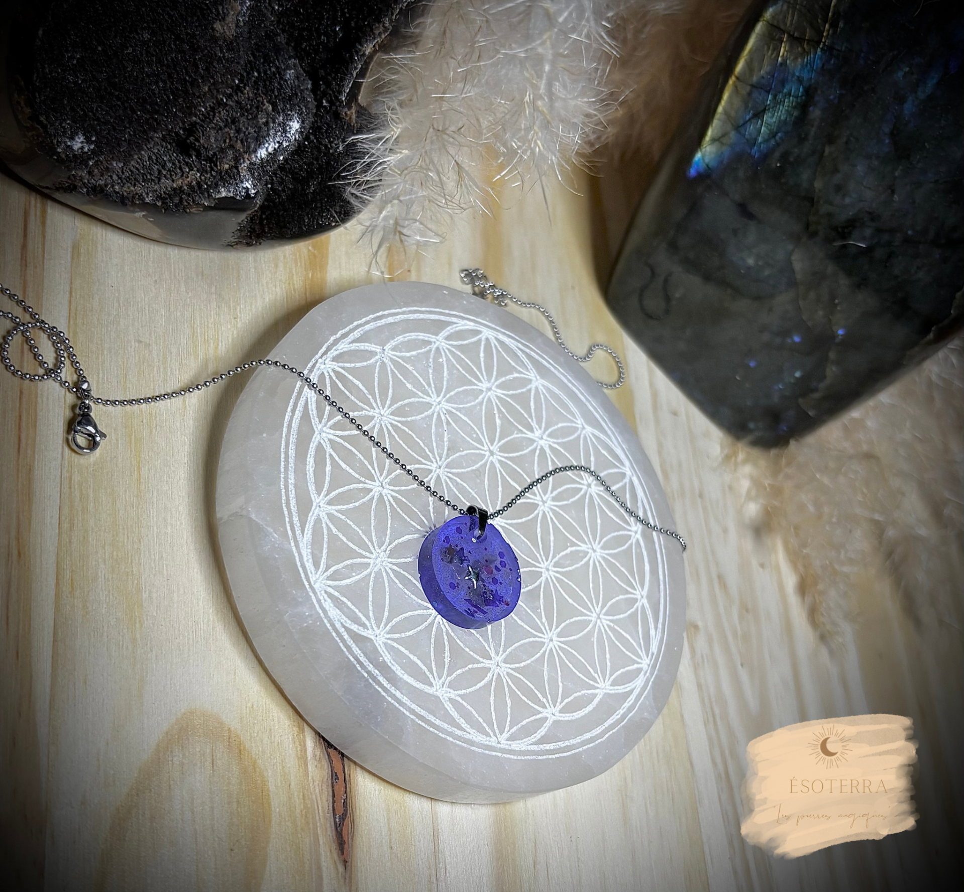 Dans LE BIJOU, vous y trouverez une ou plusieurs pierres de "Sodalite", "Améthyste" et/ou "Fluorite", des paillettes, une couleur translucide, des fleurs séchées ou objets miniatures si la place le permet, tout cela associés au Chakra correspondant au bijou.