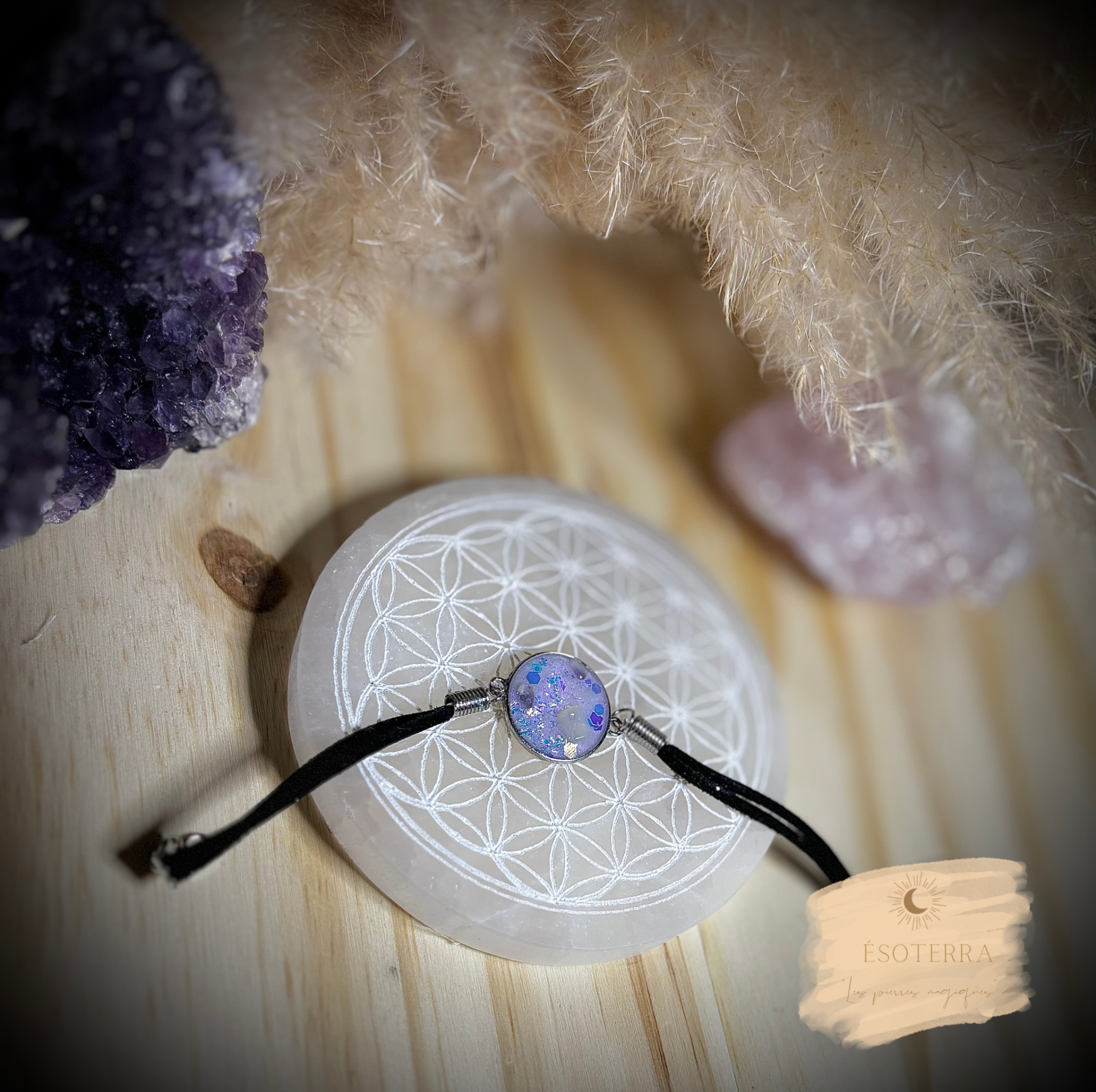 Bracelet fait main en résine Epoxy couleur Argenté en Acier inoxydable avec cordon noir en cuir.