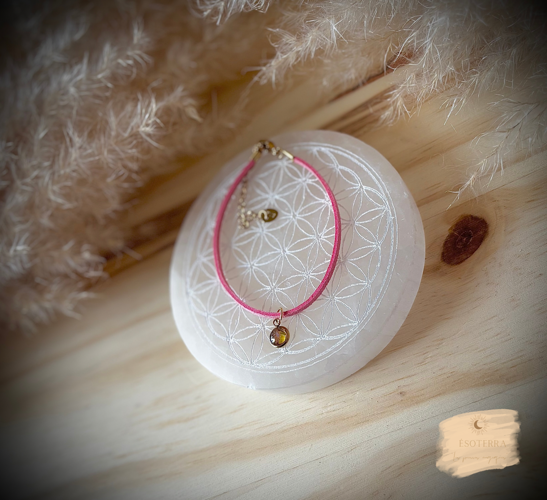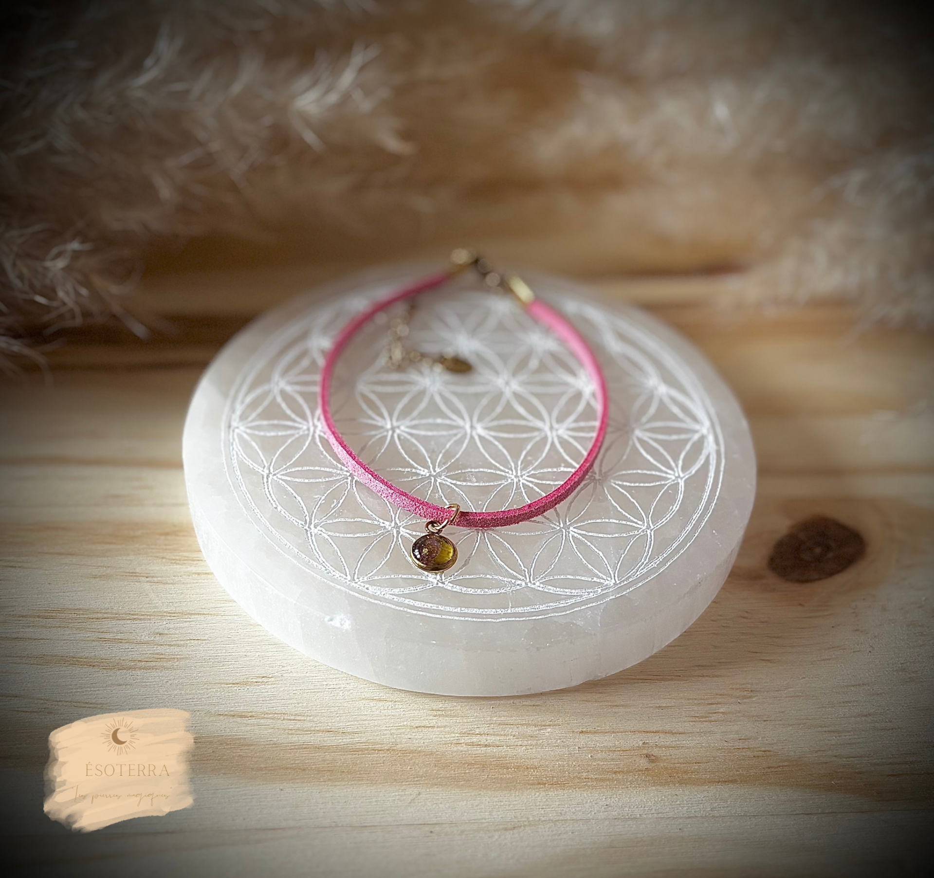 Bracelet fait main en résine époxy couleur Doré en Acier inoxydable avec cordon en cuir rose ( taille réglable ).
