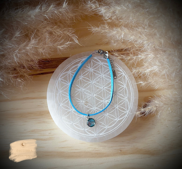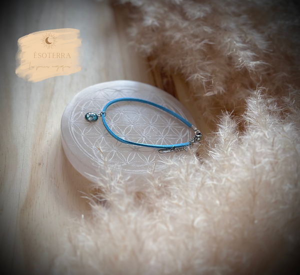 Bracelet fait main en résine époxy couleur Argenté en Acier inoxydable avec cordon en cuir bleu ( taille réglable ).