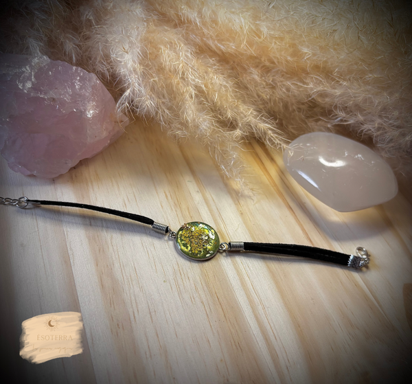 Dans LE BIJOU, vous y trouverez une ou des pierres de "Citrine jaune", des paillettes, une couleur translucide, des fleurs séchées ou objets miniatures si la place le permet, tout cela associés au chakra correspondant au bijou.