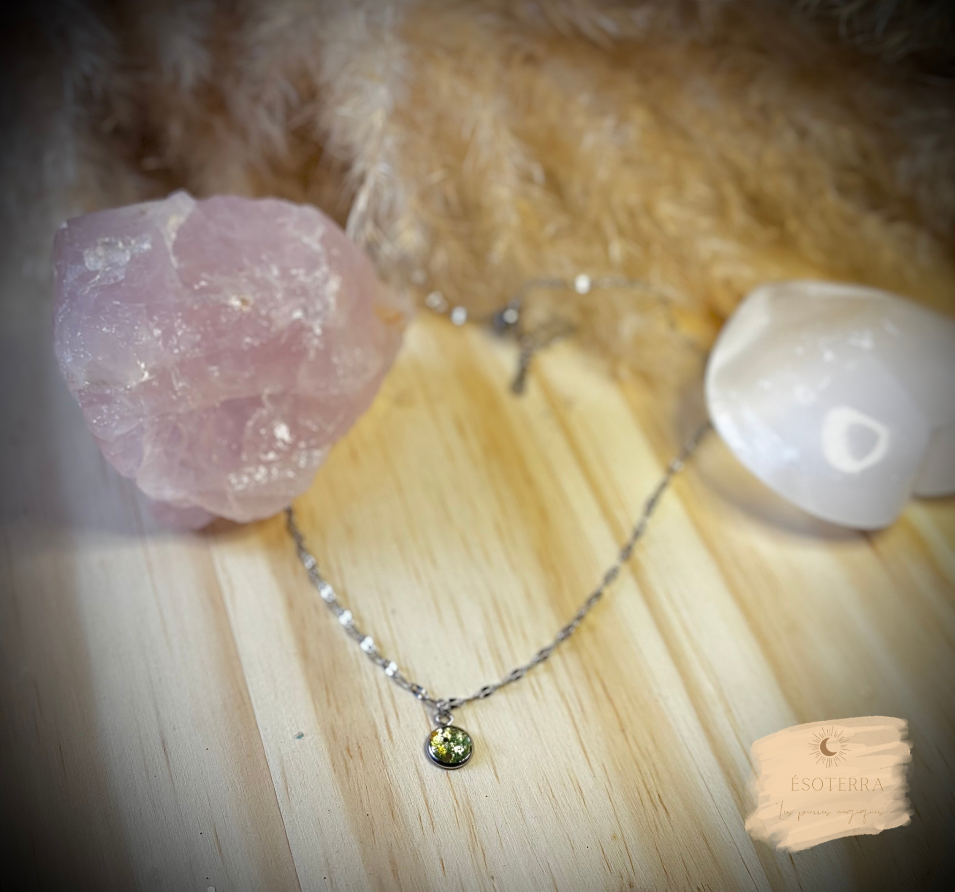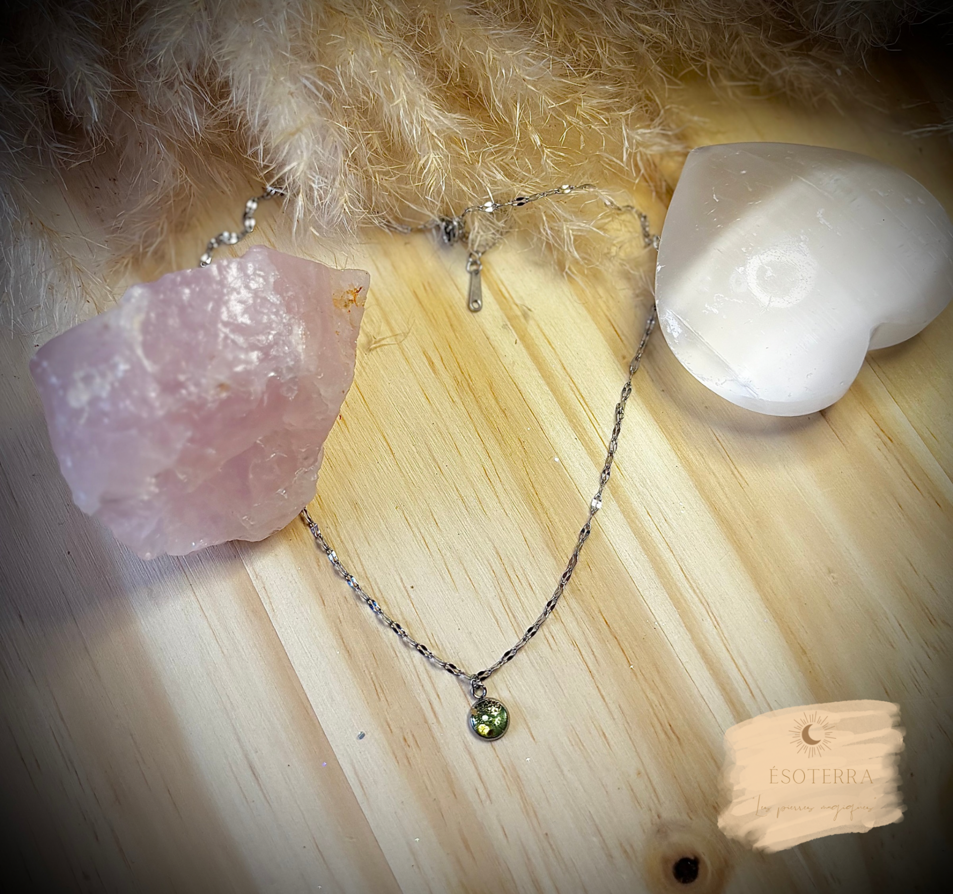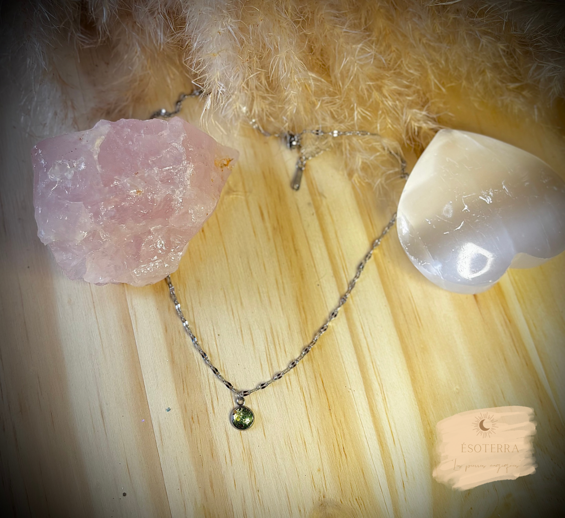 Dans LE BIJOU, vous y trouverez une ou des pierres de "Citrine jaune", des paillettes, une couleur translucide, des fleurs séchées ou objets miniatures si la place le permet, tout cela associés au chakra correspondant au bijou.