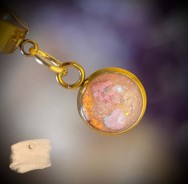 Dans le bijou, vous y trouverez une ou plusieurs pierre de Quartz rose &/ou d'Aventurine verte, de la pourdre de Micca, une couleur translucide, des fleurs séchées ou objets miniatures si la place le permet, tout cela associés à la blessure concernant le bijou.