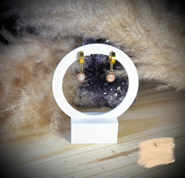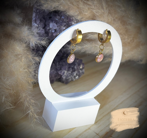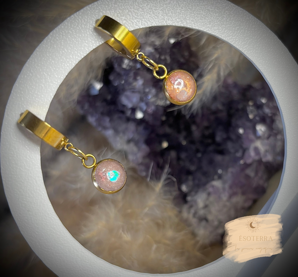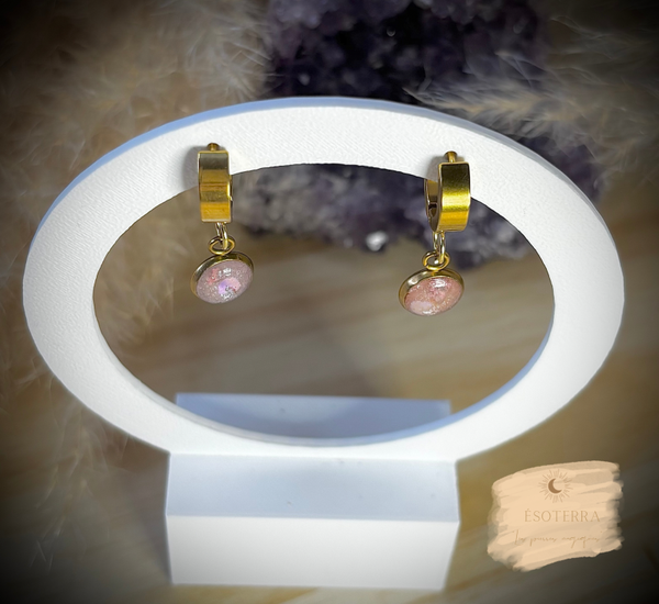 Boucles d'oreilles fait main en résine époxy avec petites créoles de couleur Dorée en Acier inoxydable.
