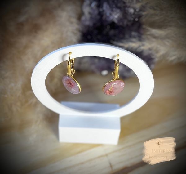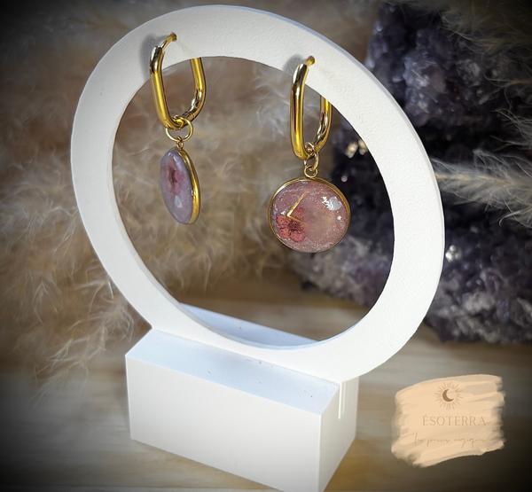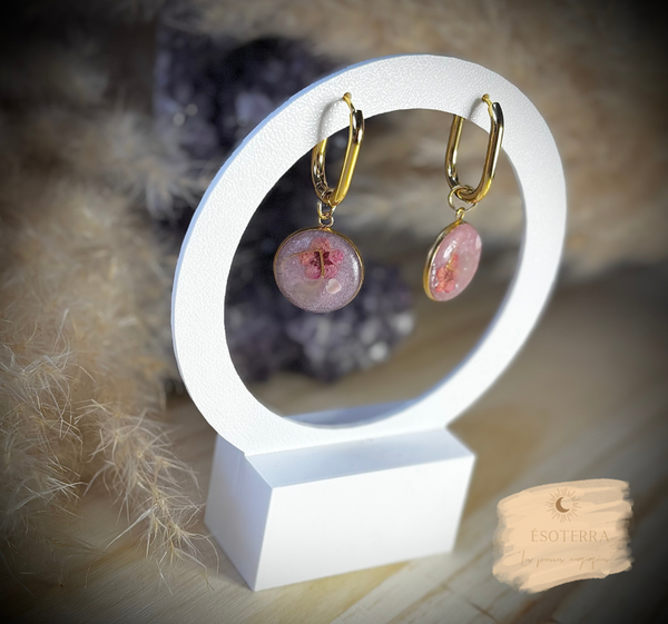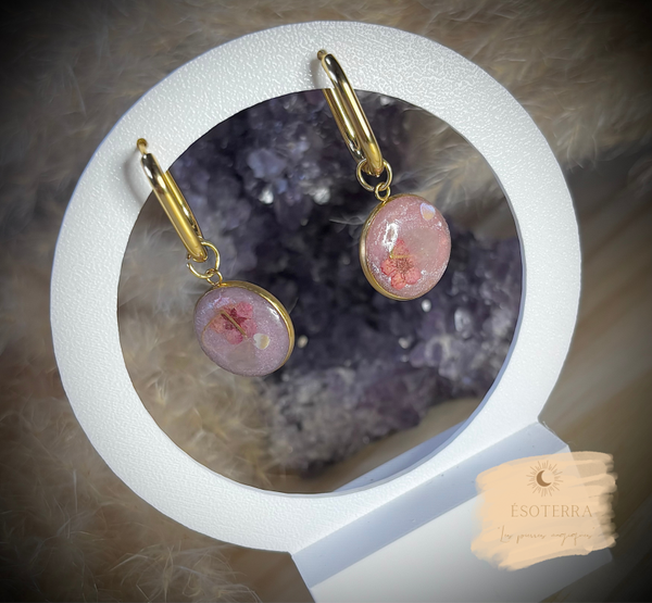 Boucles d'oreilles fait main en résine époxy avec créoles couleur Dorée en Acier inoxydable.