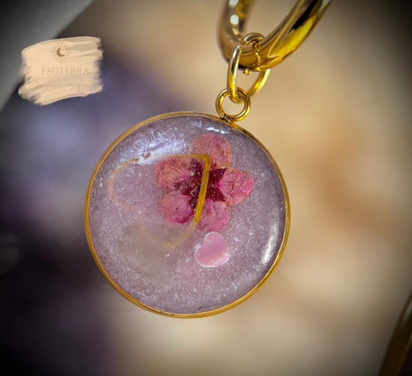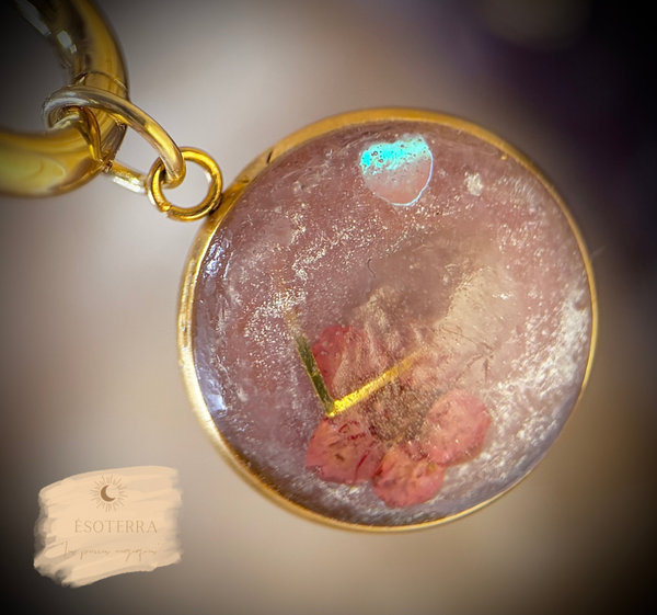 Dans le bijou, vous y trouverez une ou plusieurs pierre de Quartz rose &/ou d'Aventurine verte, de la pourdre de Micca, une couleur translucide, des fleurs séchées ou objets miniatures si la place le permet, tout cela associés à la blessure concernant le bijou.