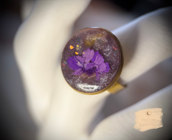 Dans le bijou, vous y trouverez une ou plusieurs pierres d'Amethyste et/ou de Labradorite, de la pourdre de Micca, une couleur translucide, des fleurs séchées ou objets miniatures si la place le permet, tout cela associés à la blessure concernant le bijou.