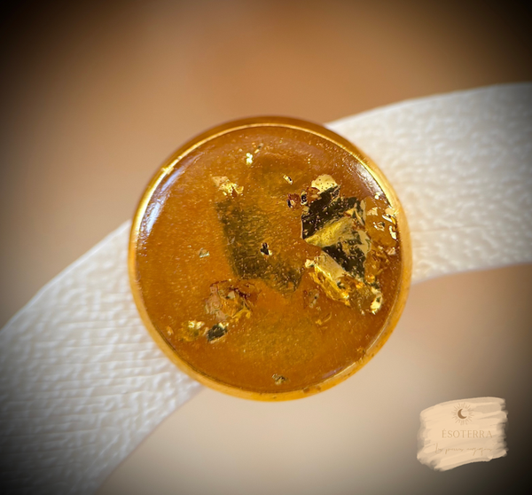 Dans le bijou, vous y trouverez une ou plusieurs pierres de Citrine et/ou Œil de tigre, de la pourdre de Micca, une couleur translucide, des feuilles dorées ou objets miniatures si la place le permet, tout cela associés à la blessure concernant le bijou.