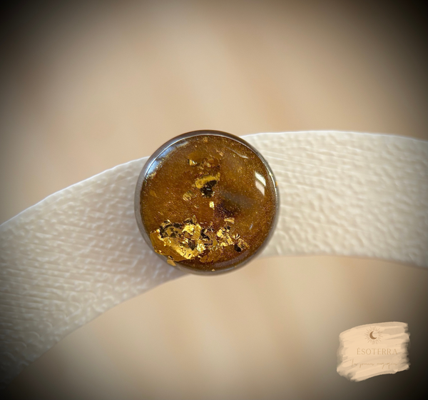 Dans le bijou, vous y trouverez une ou plusieurs pierres de Citrine et/ou Œil de tigre, de la pourdre de Micca, une couleur translucide, des feuilles dorées ou objets miniatures si la place le permet, tout cela associés à la blessure concernant le bijou.