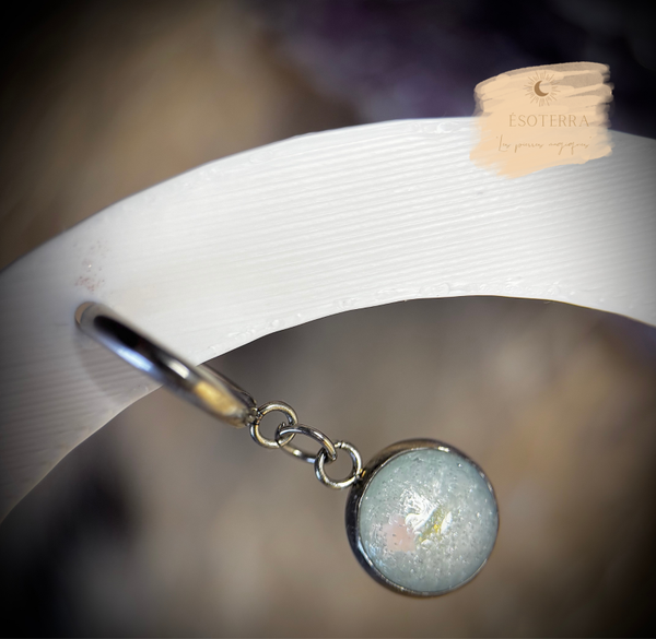 Dans le bijou, vous y trouverez une ou plusieurs pierres de Howlite et/ou Sodalite, de la pourdre de Micca, une couleur translucide, des étoiles et/ou objets miniatures si la place le permet, tout cela associés à la blessure concernant le bijou.