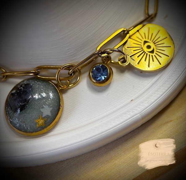 Dans le bijou, vous y trouverez une ou plusieurs pierres de Howlite et/ou Sodalite, de la pourdre de Micca, une couleur translucide, des étoiles et/ou objets miniatures si la place le permet, tout cela associés à la blessure concernant le bijou.