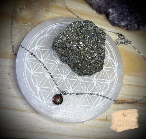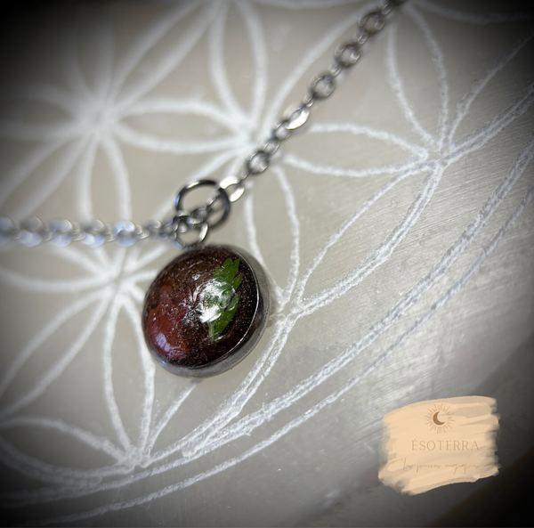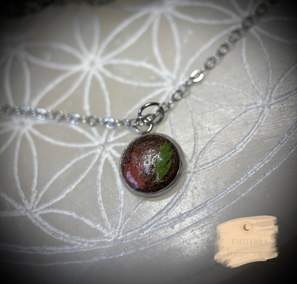 Dans le bijou, vous y trouverez une ou plusieurs pierres de Jaspe Rouge/brun et/ou de Pierre de soleil, de la pourdre de Micca, une couleur translucide, des feuillages séchés et/ou objets miniatures si la place le permet, tout cela associés à la blessure concernant le bijou.