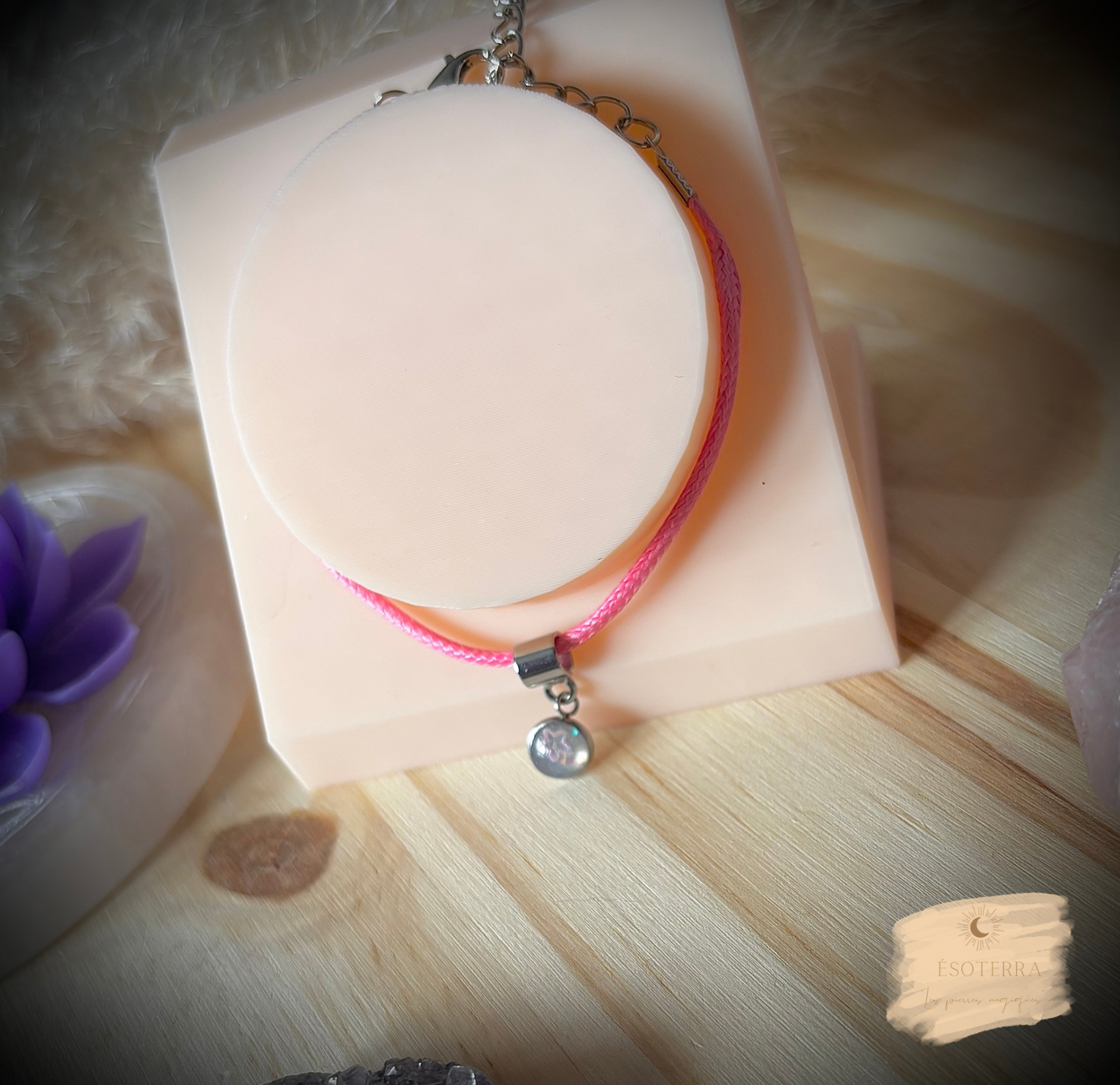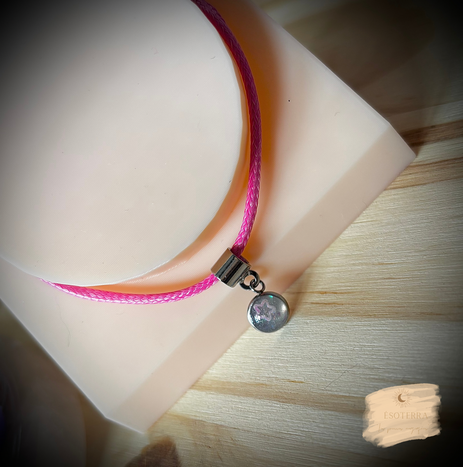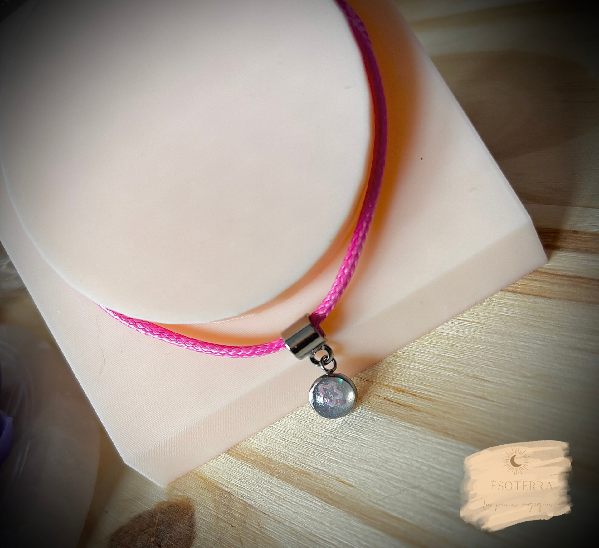 Bracelet fait main en résine époxy couleur Argenté en Acier inoxydable et cordon rose synthétique.