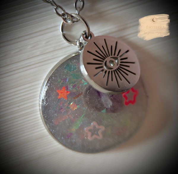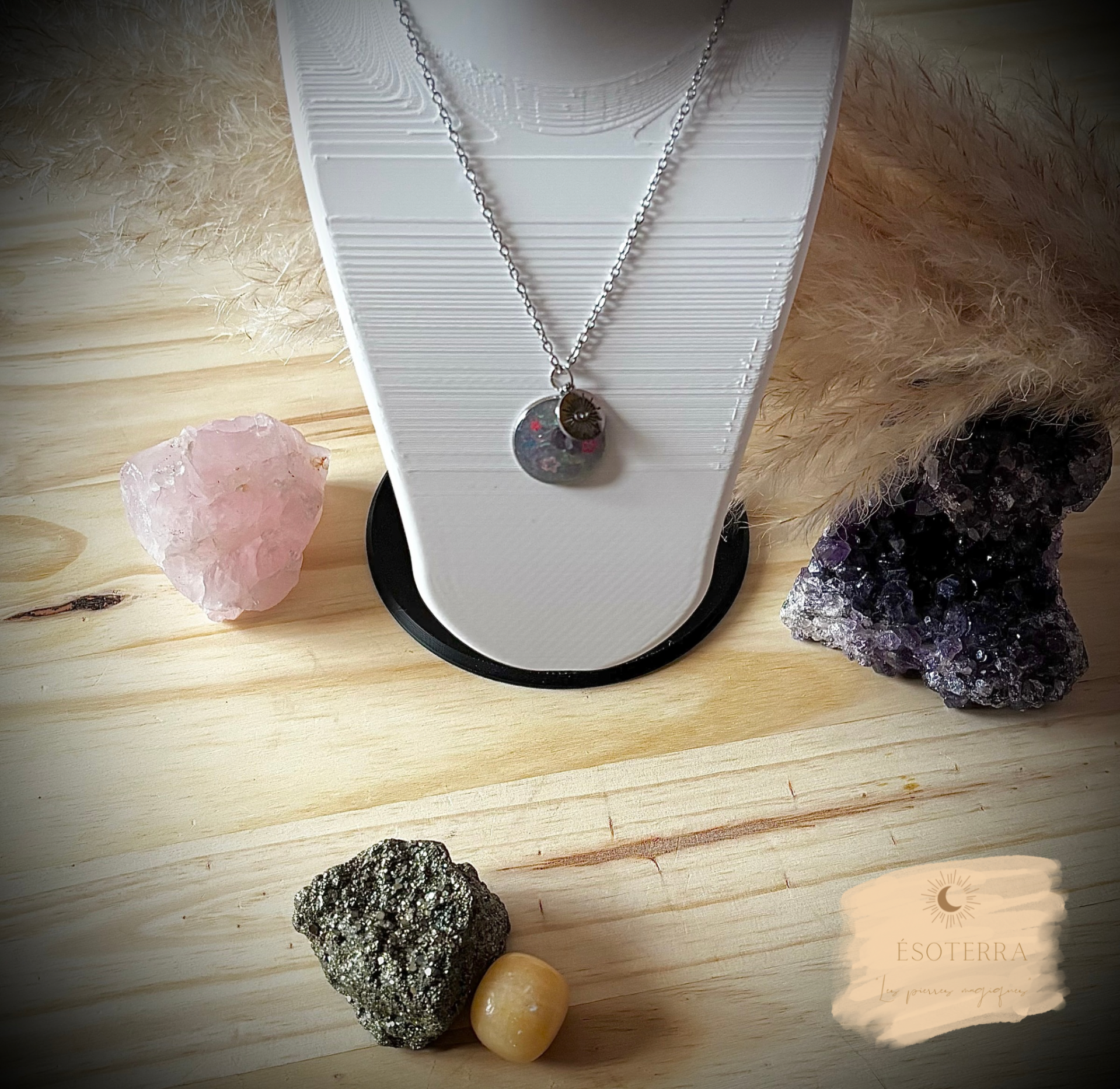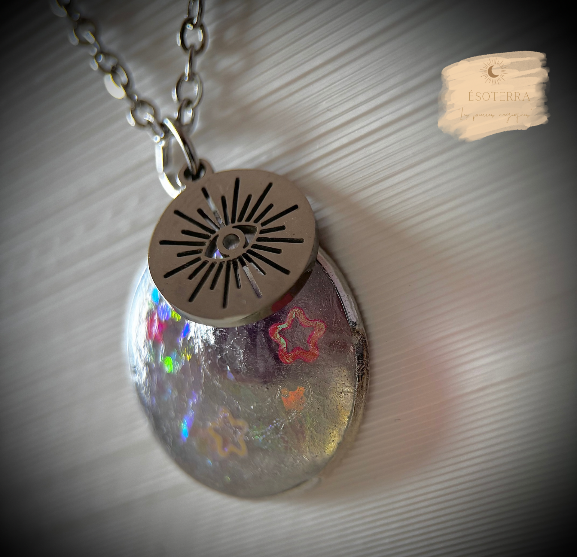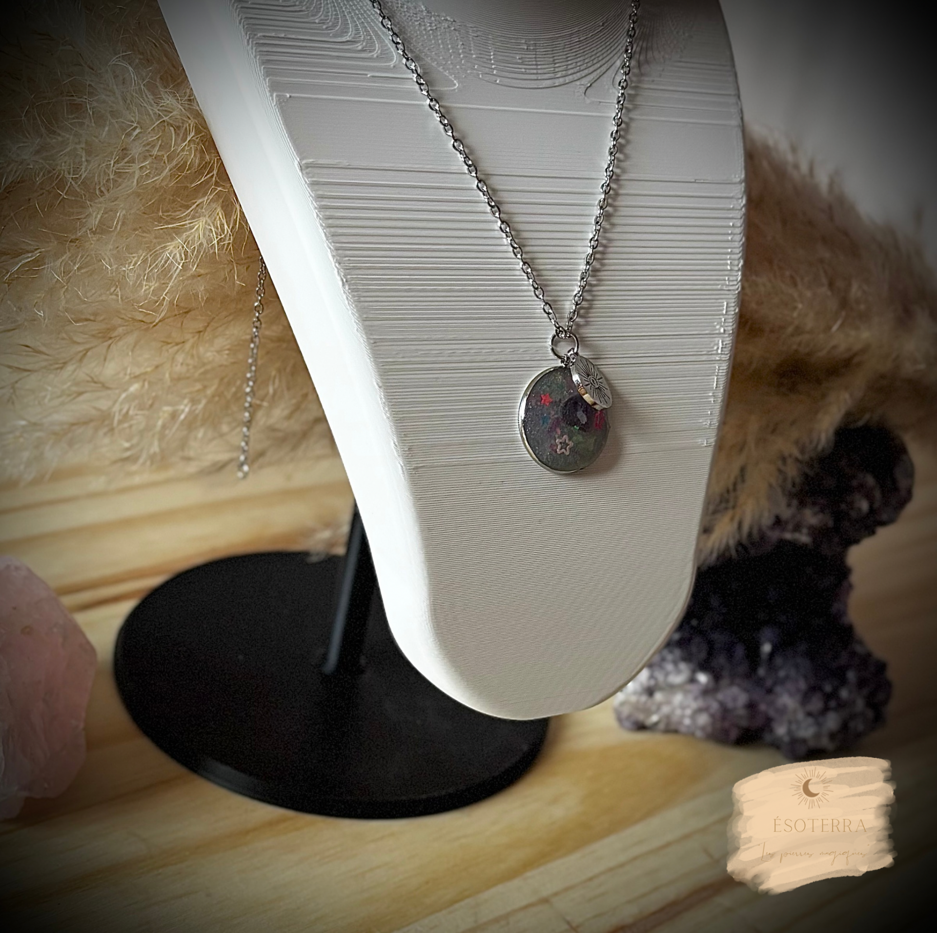 Pendentif avec chaîne couleur Argenté en Acier inoxydable fait main en résine époxy.
