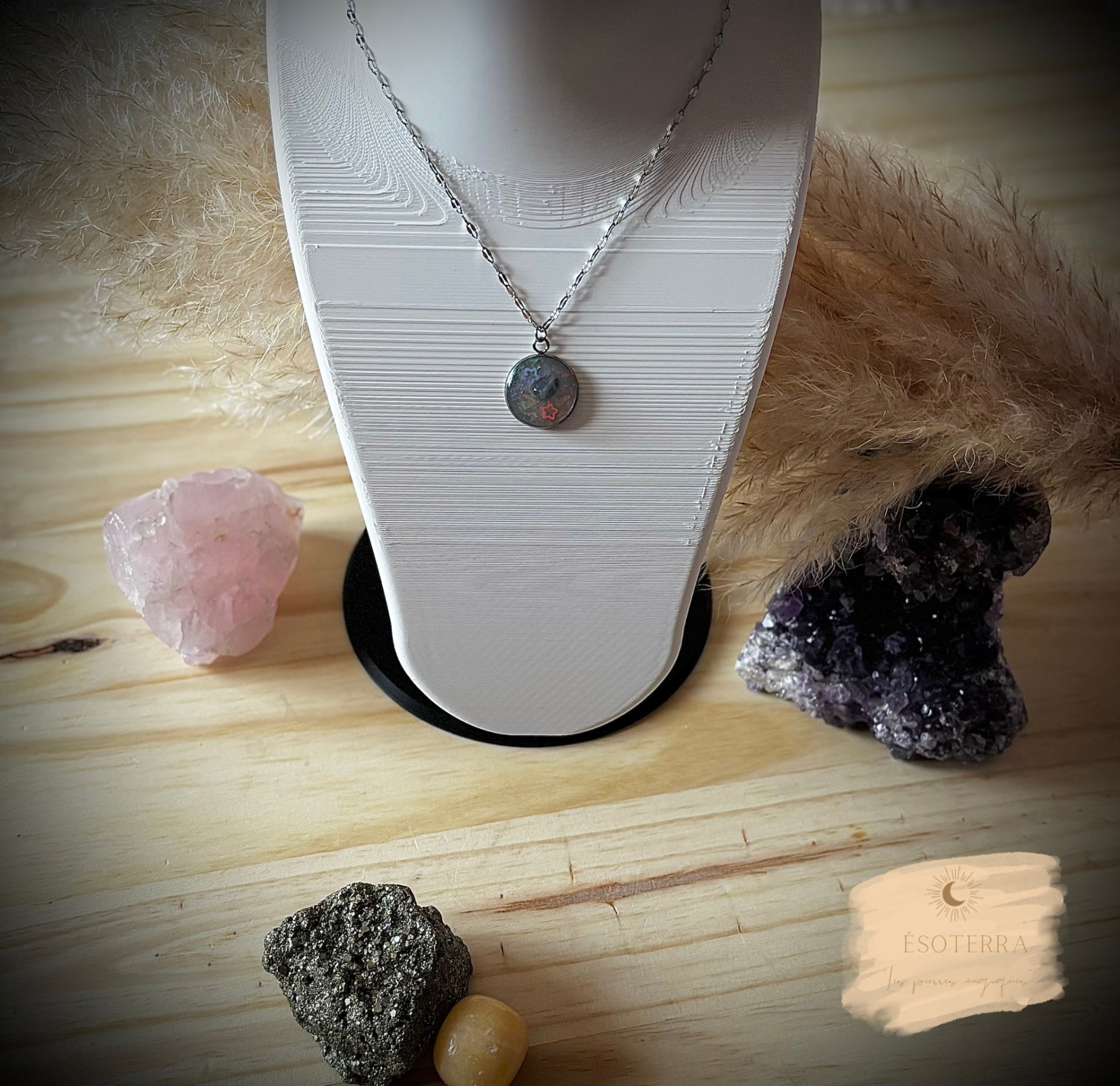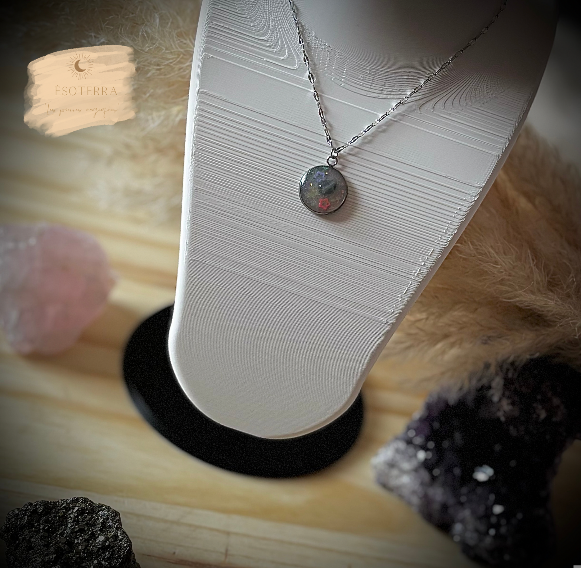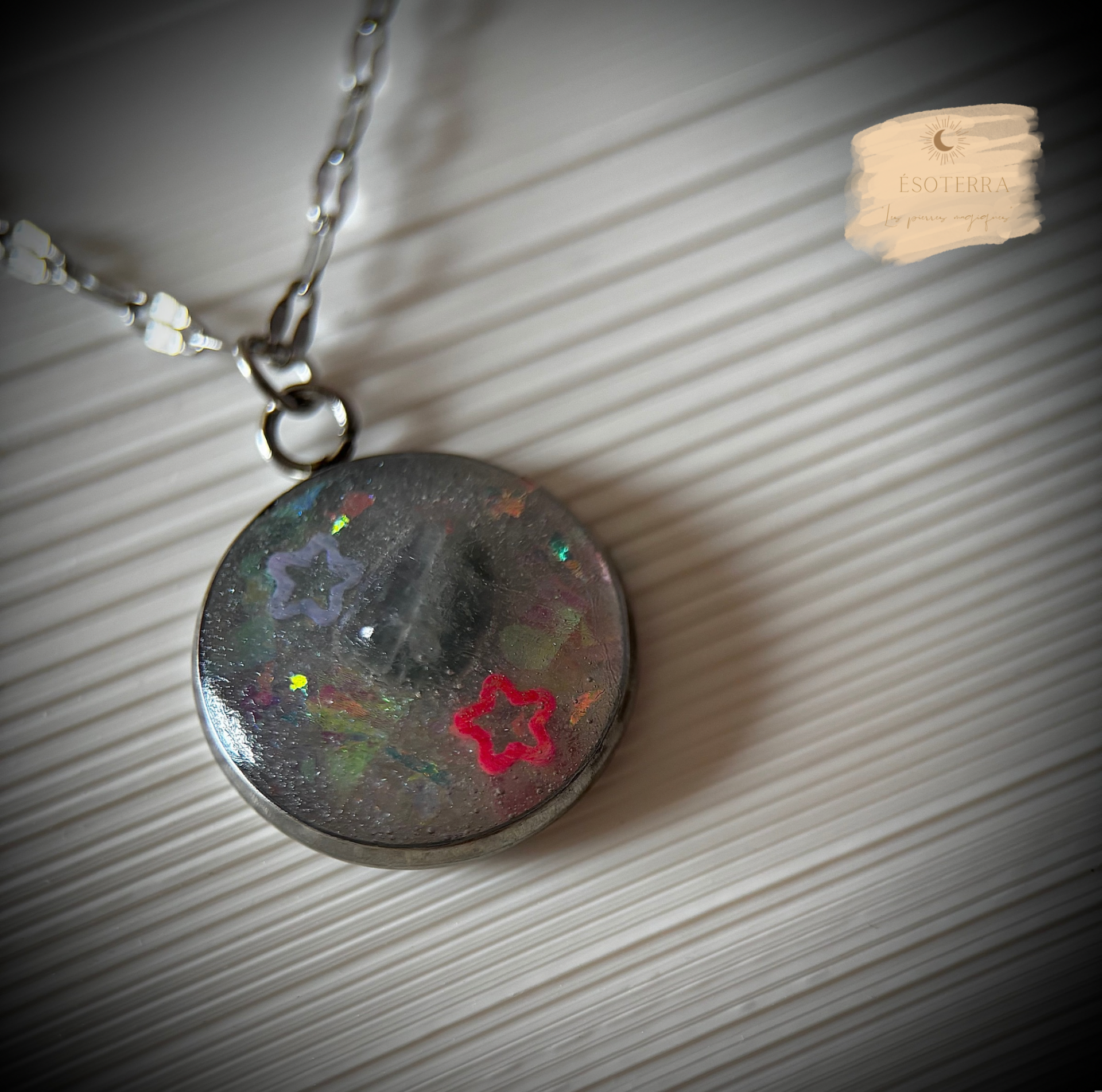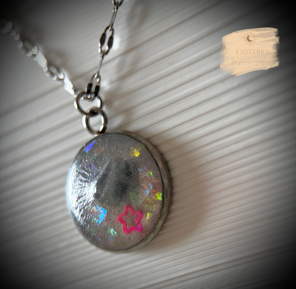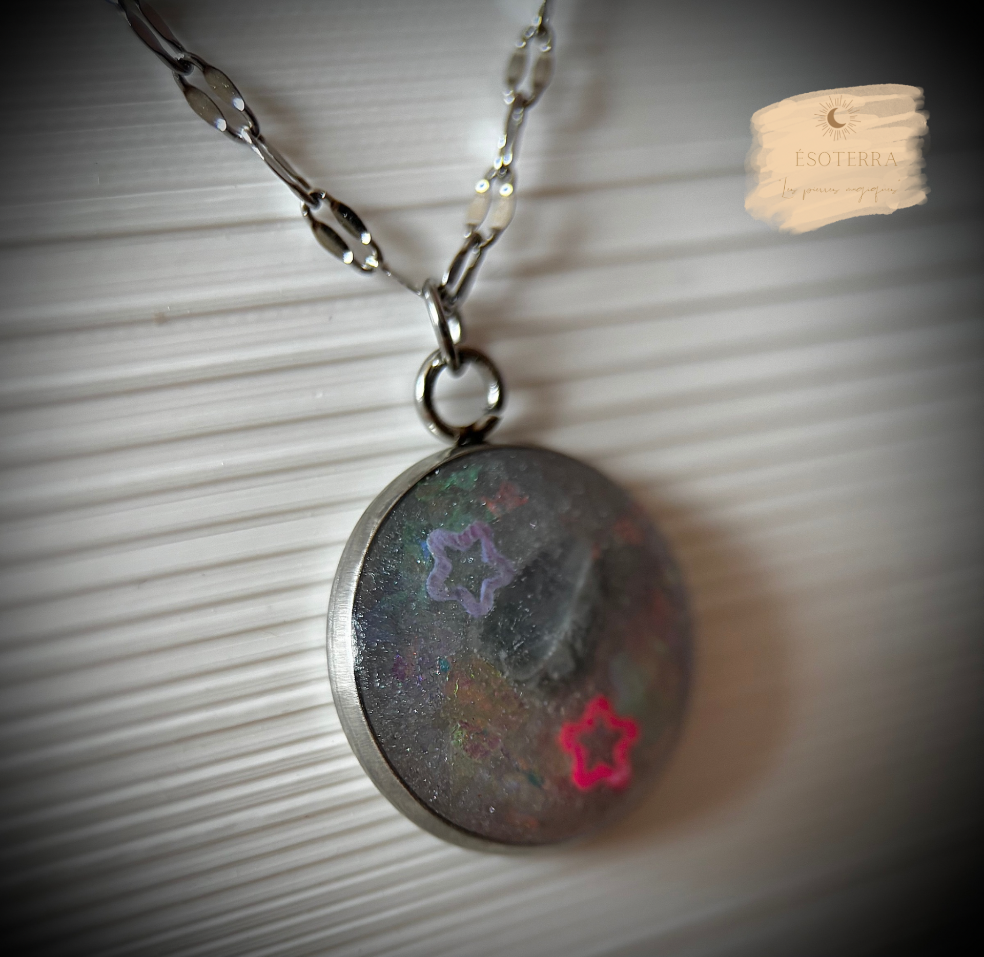 Pendentif avec chaîne couleur Argenté en Acier inoxydable fait main en résine époxy.