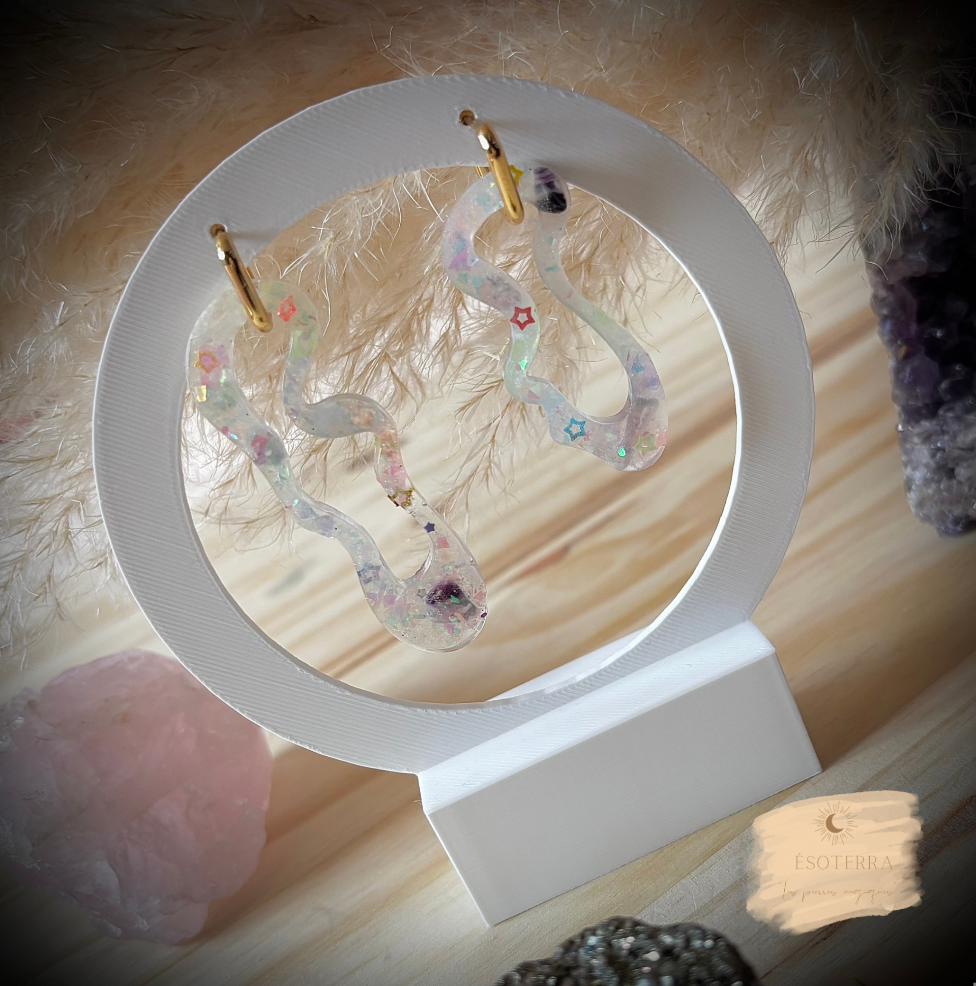 Boucles d'oreilles fait main en résine époxy avec créoles couleur Dorée en Acier inoxydable.