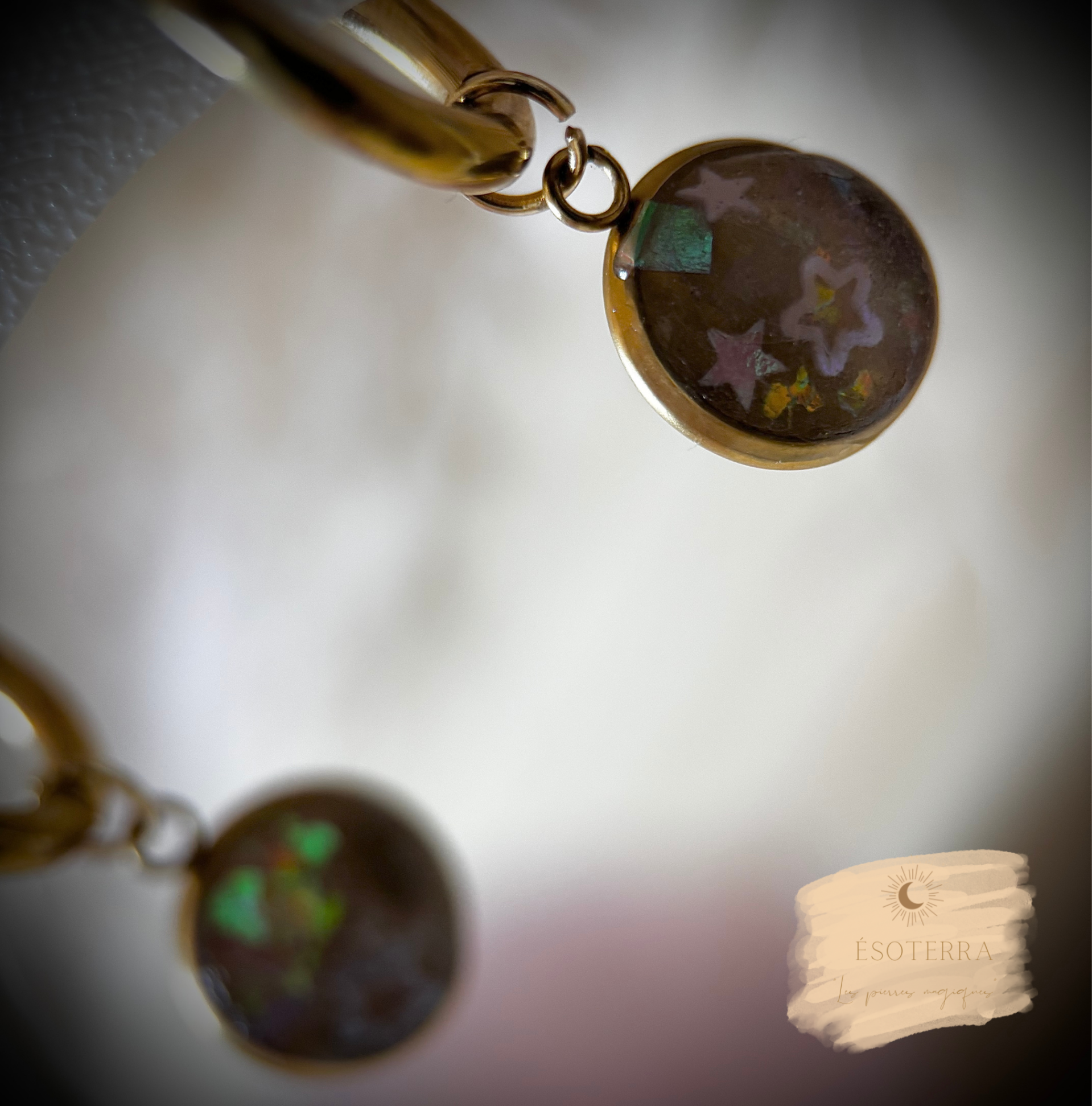 Dans le bijou, vous y trouverez une ou plusieurs pierre(s) de Fluorite arc-en-ciel 🌈, de la pourdre de Mica nacrée blanche, des étoiles multicolores rapellant l'arc-en-ciel et la guérison & des feuilles Foil transparentes colorées de toutes les couleurs douces et subtiles ( si la place le permet ), tout cela associés à la blessure concernant le bijou.
