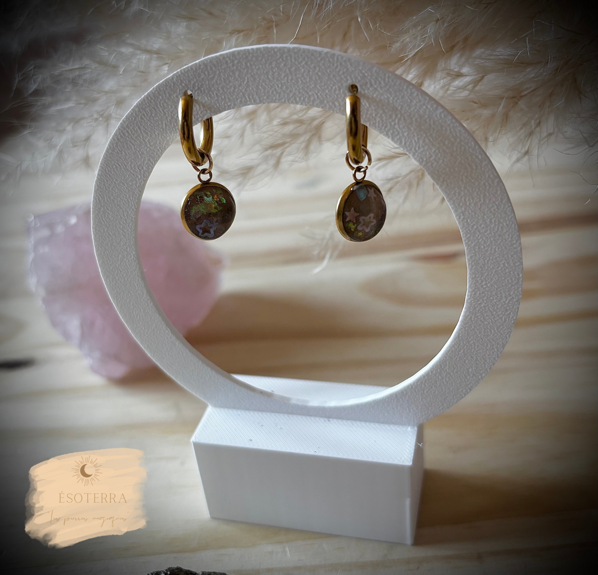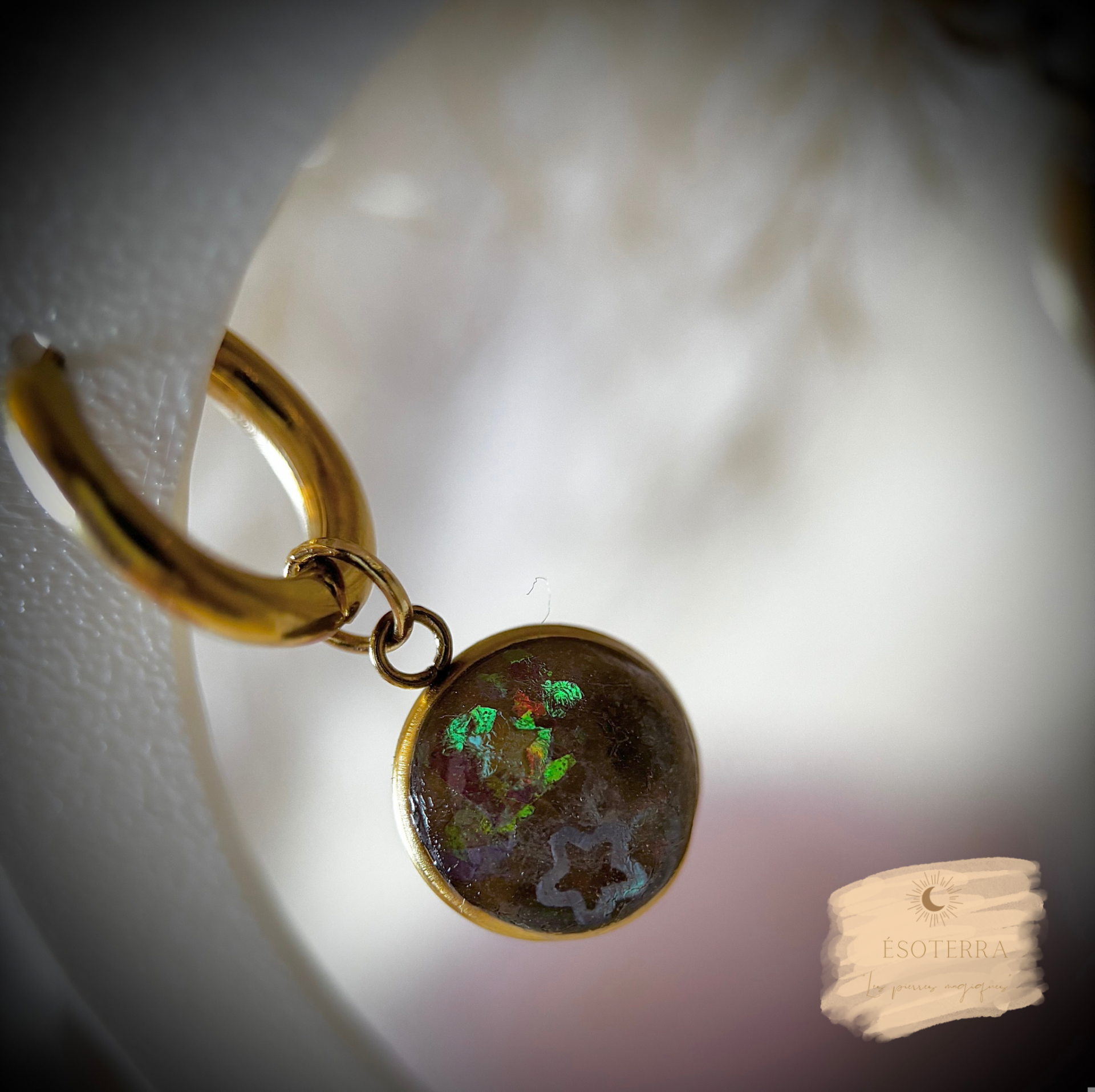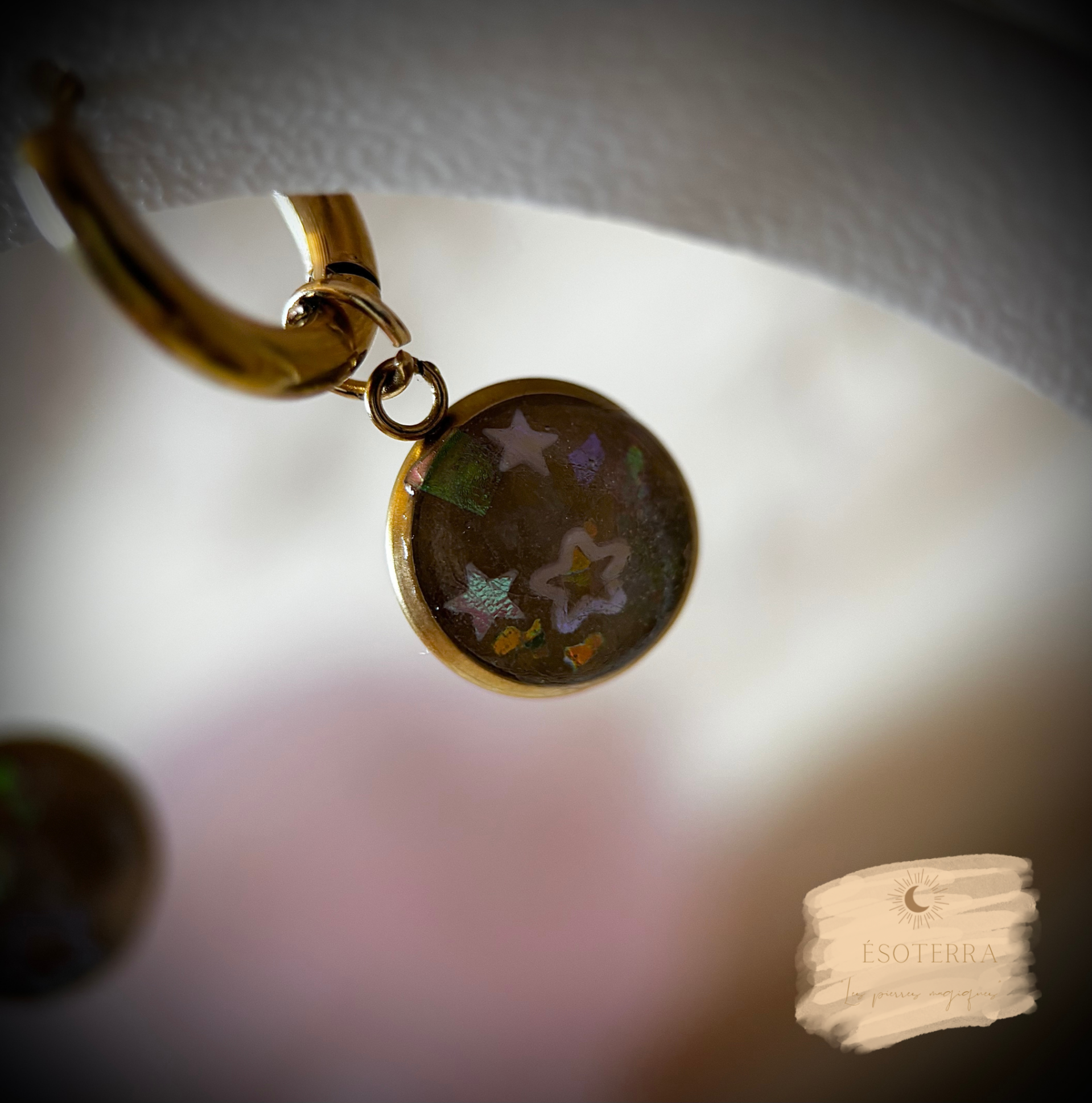 Boucles d'oreilles fait main en résine époxy avec créoles couleur Dorée en Acier inoxydable.