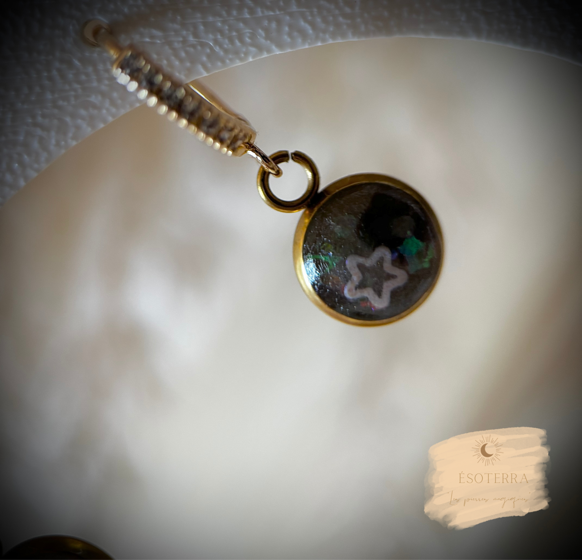 Boucles d'oreilles fait main en résine époxy avec créoles couleur Dorée en Acier inoxydable.