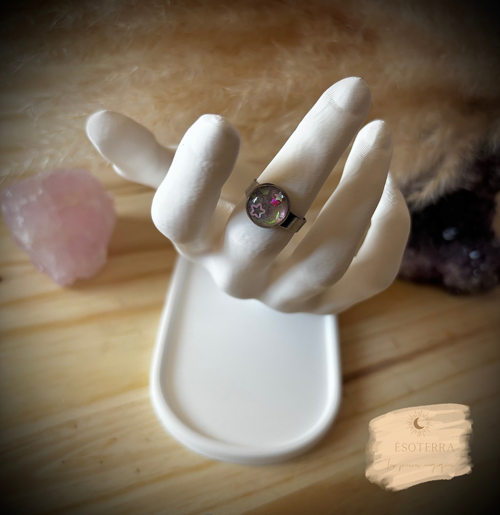 Bague réglable fait main en résine époxy couleur Argentée en Acier inoxydable avec breloque.