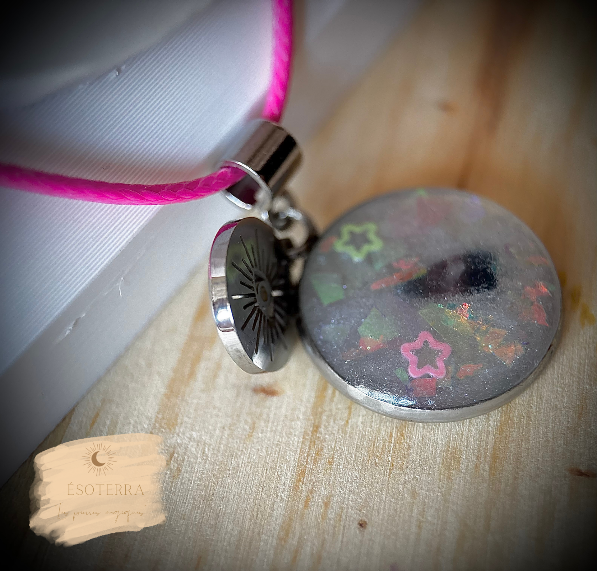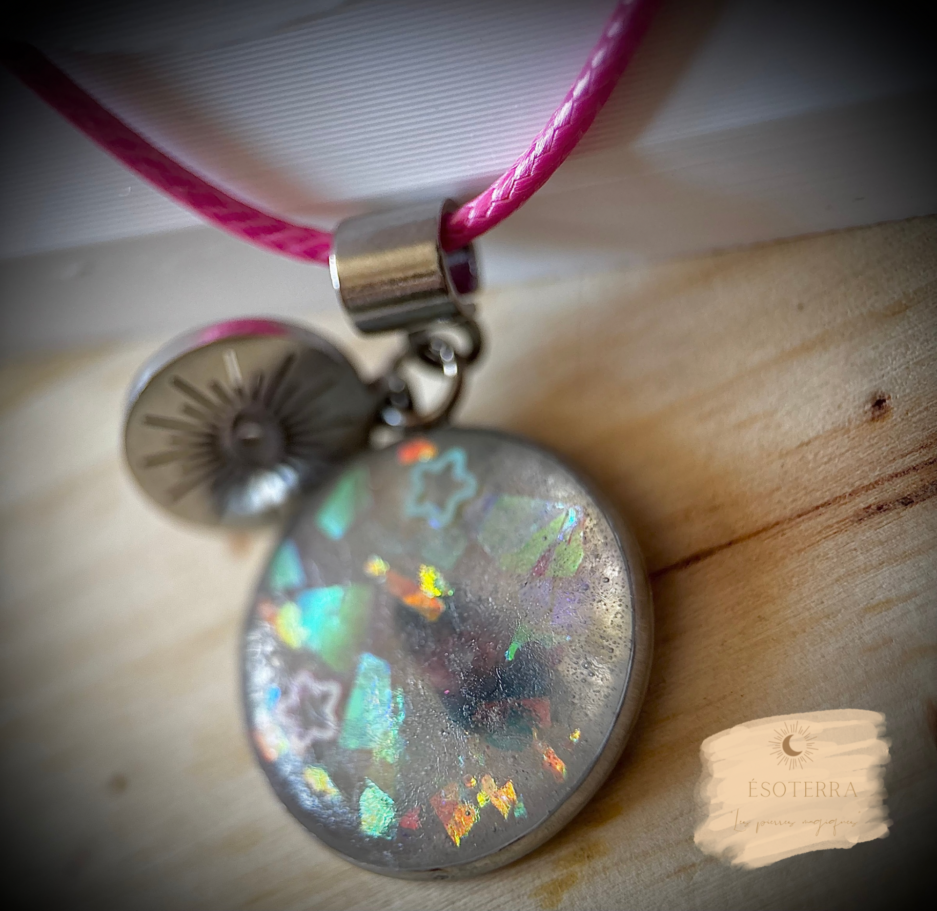 Dans le bijou, vous y trouverez une ou plusieurs pierre(s) de Fluorite arc-en-ciel 🌈, de la pourdre de Mica nacrée blanche, des étoiles multicolores rapellant l'arc-en-ciel et la guérison & des feuilles Foil transparentes colorées de toutes les couleurs douces et subtiles ( si la place le permet ), tout cela associés à la blessure concernant le bijou.