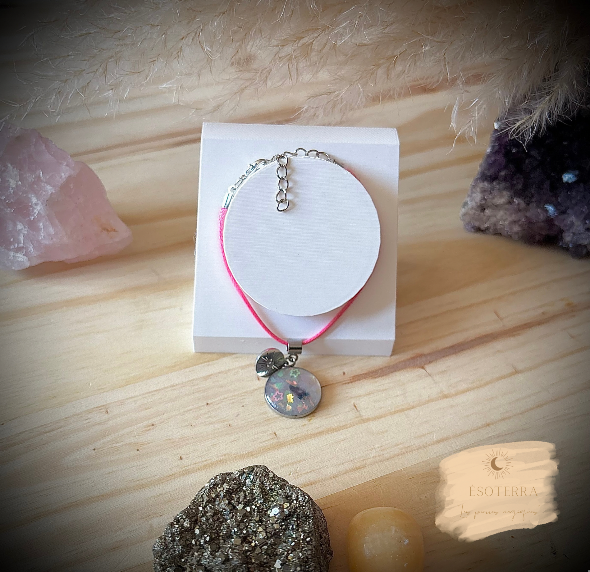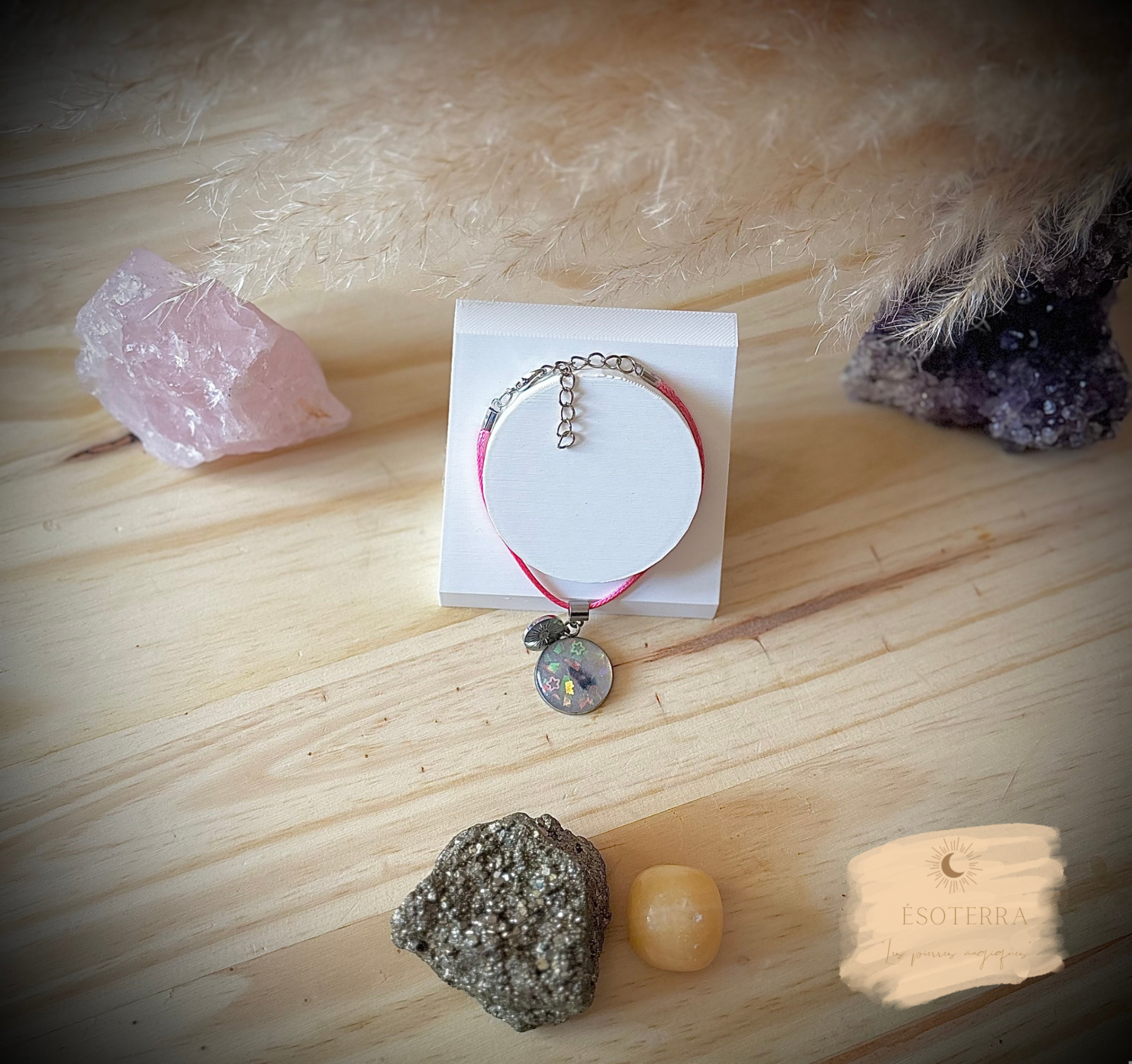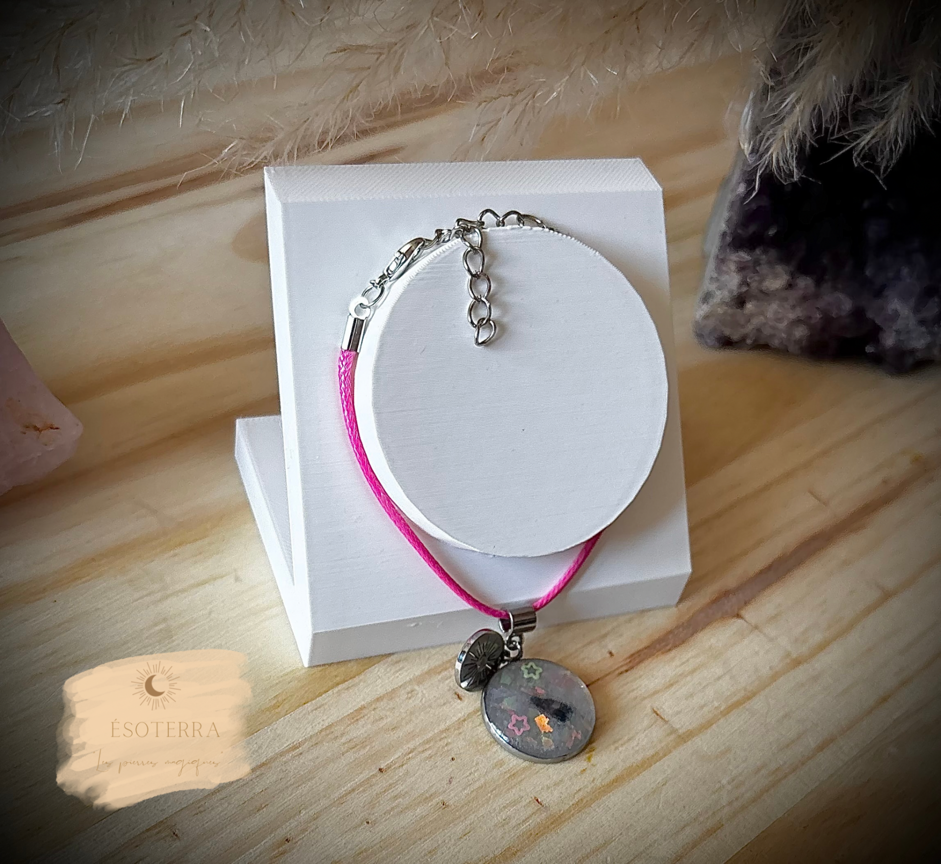 Bracelet fait main en résine époxy couleur Argenté en Acier inoxydable et cordon rose synthétique.