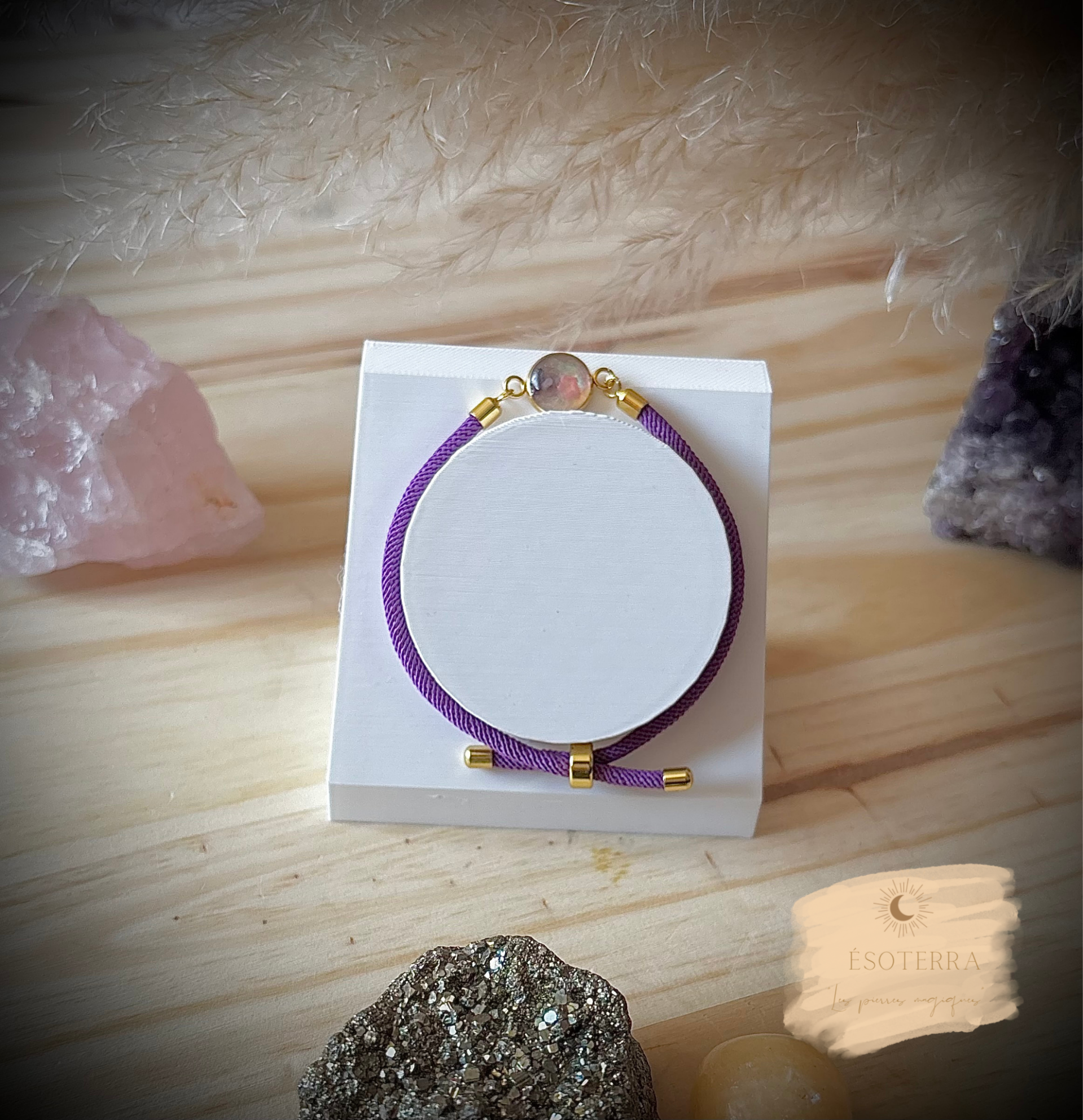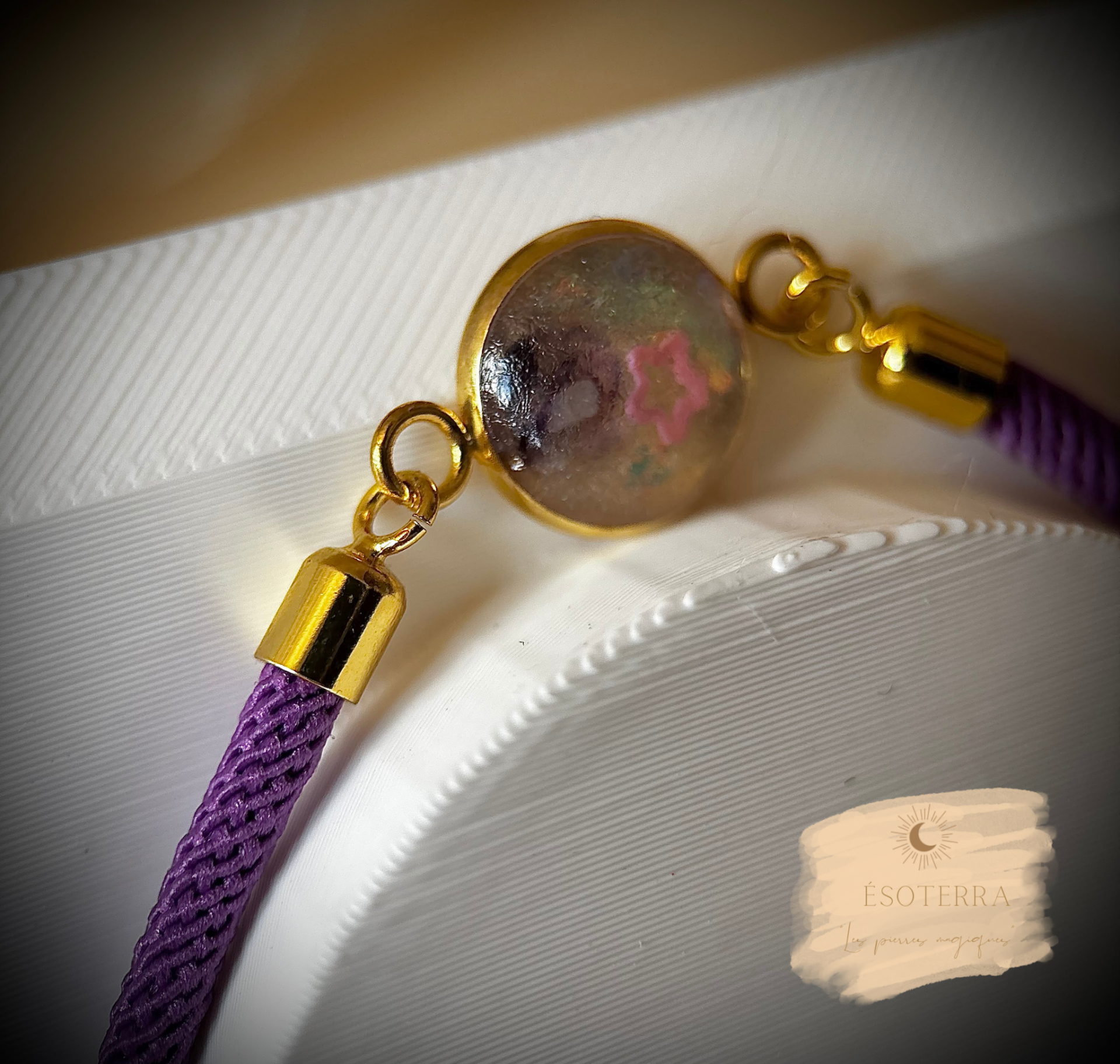 Bracelet fait main en résine époxy couleur Dorée en Acier inoxydable et cordon violet.