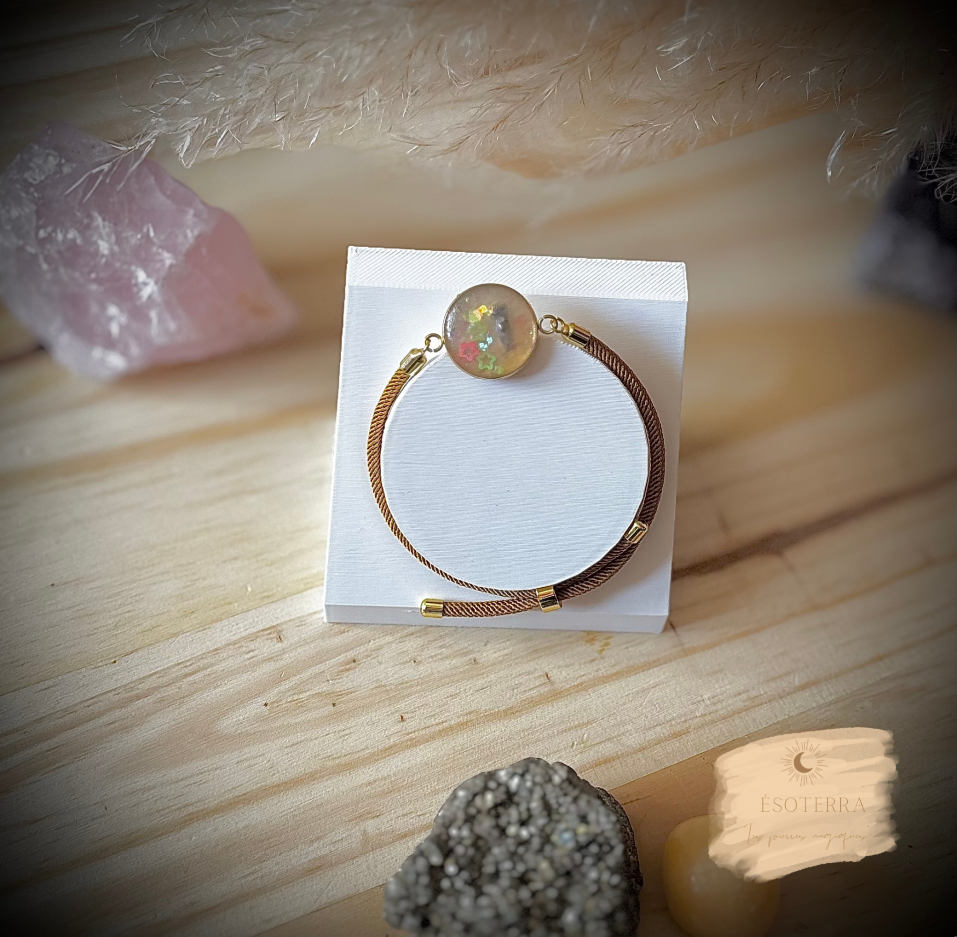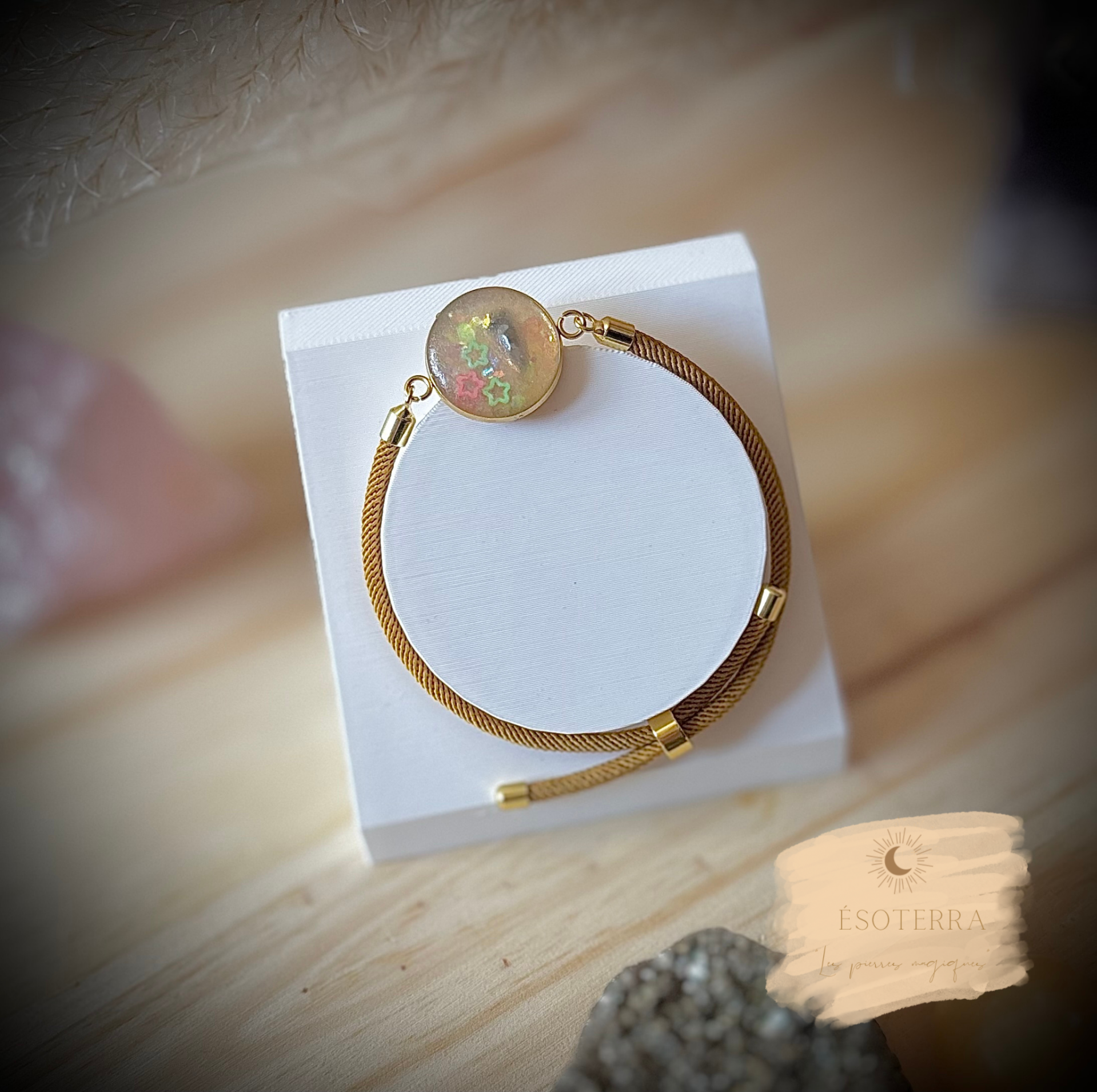 Bracelet fait main en résine époxy couleur Dorée en Acier inoxydable et cordon camel/moutarde.