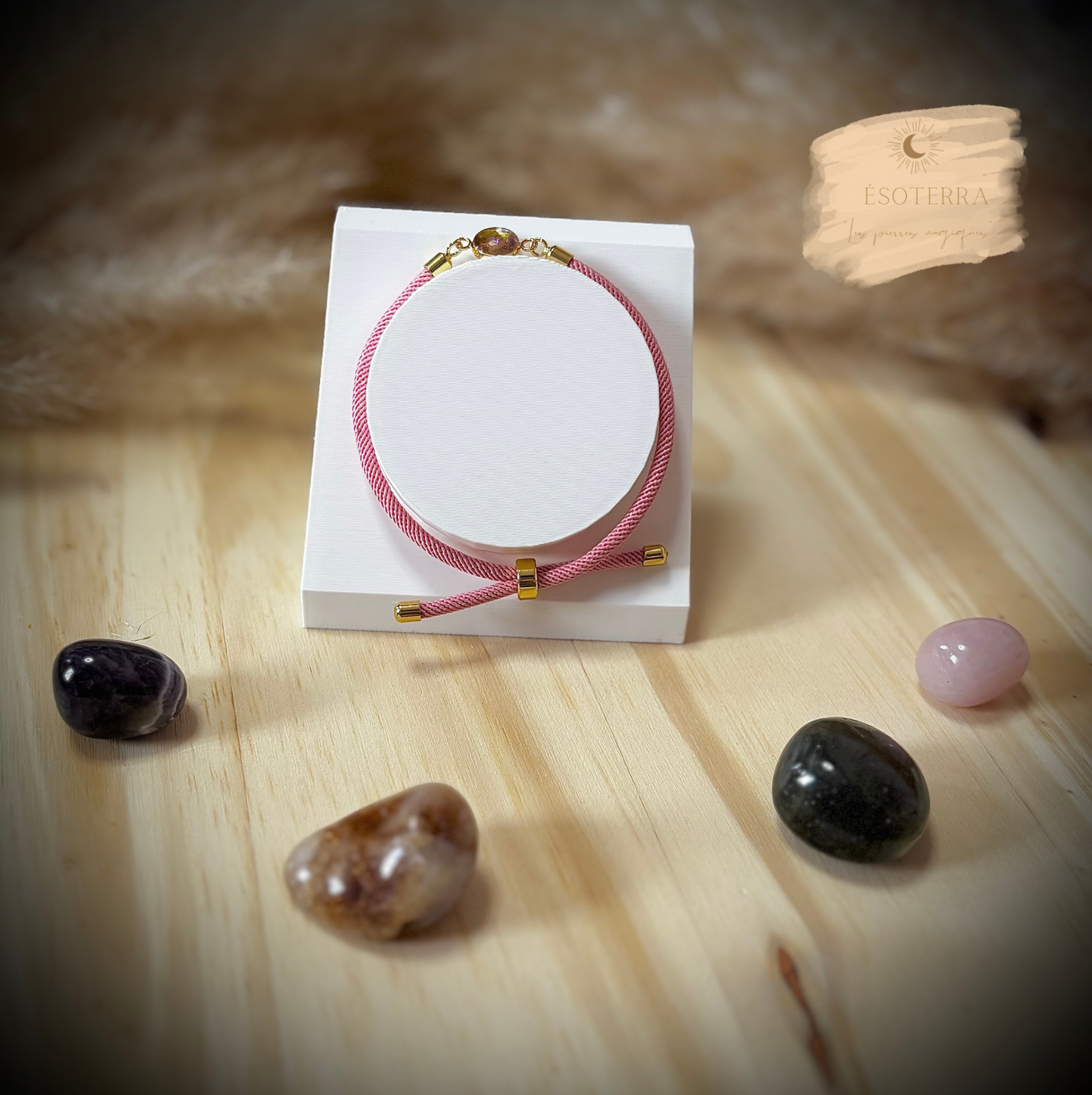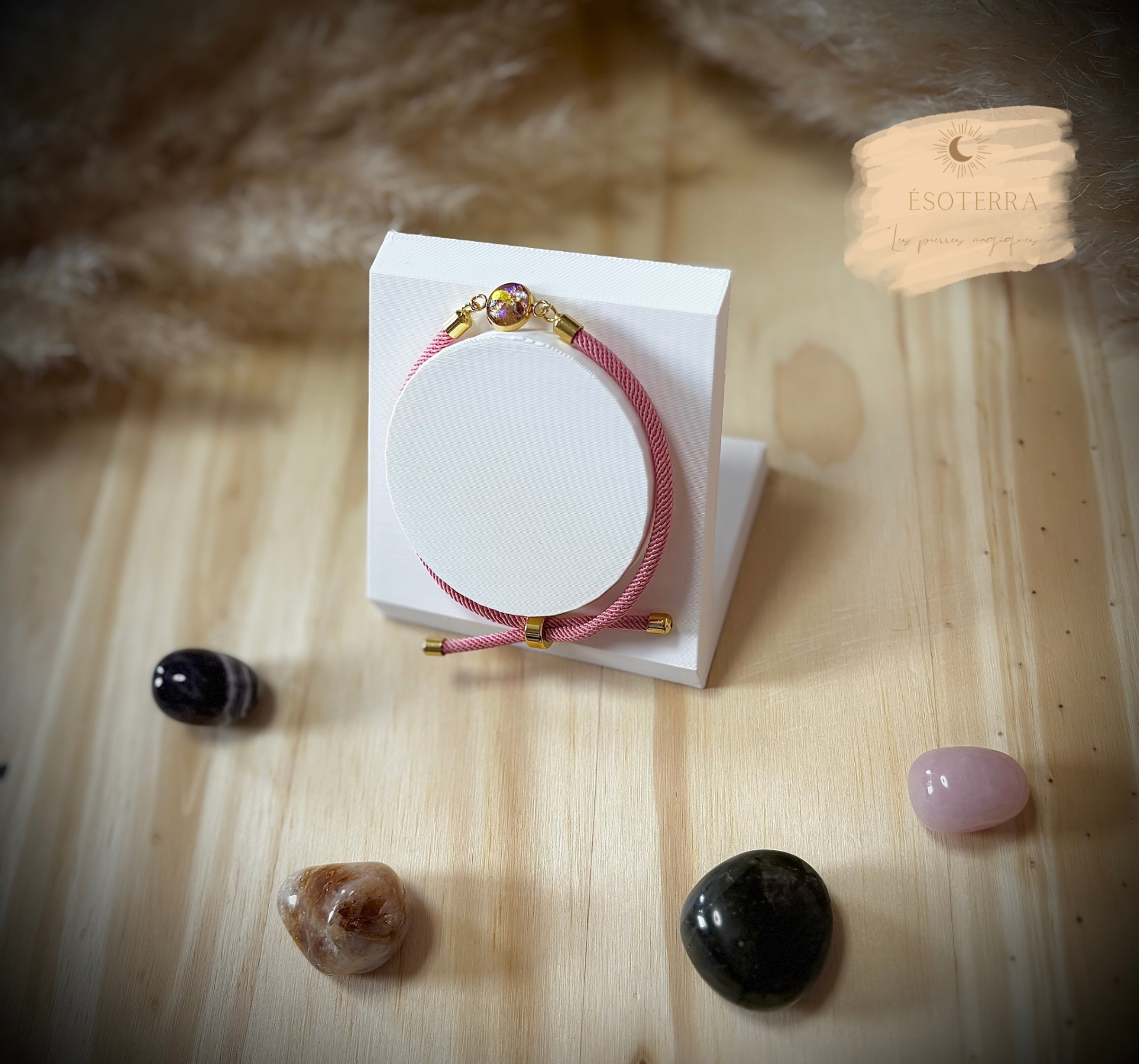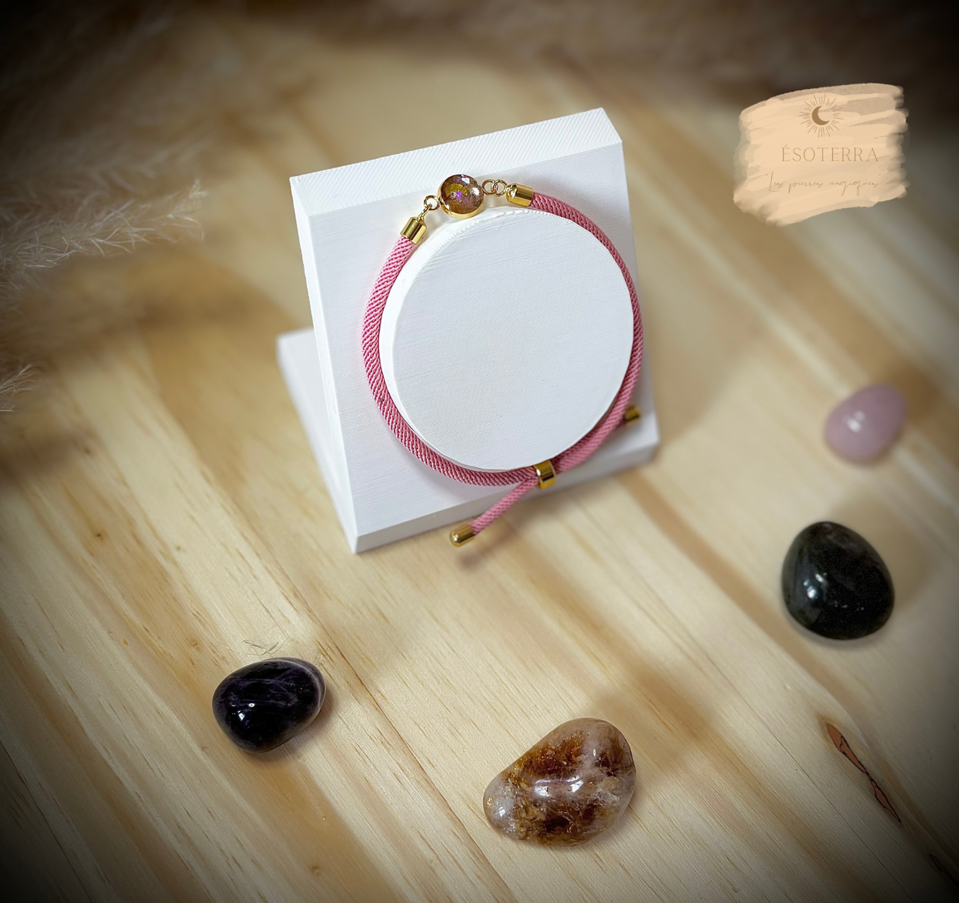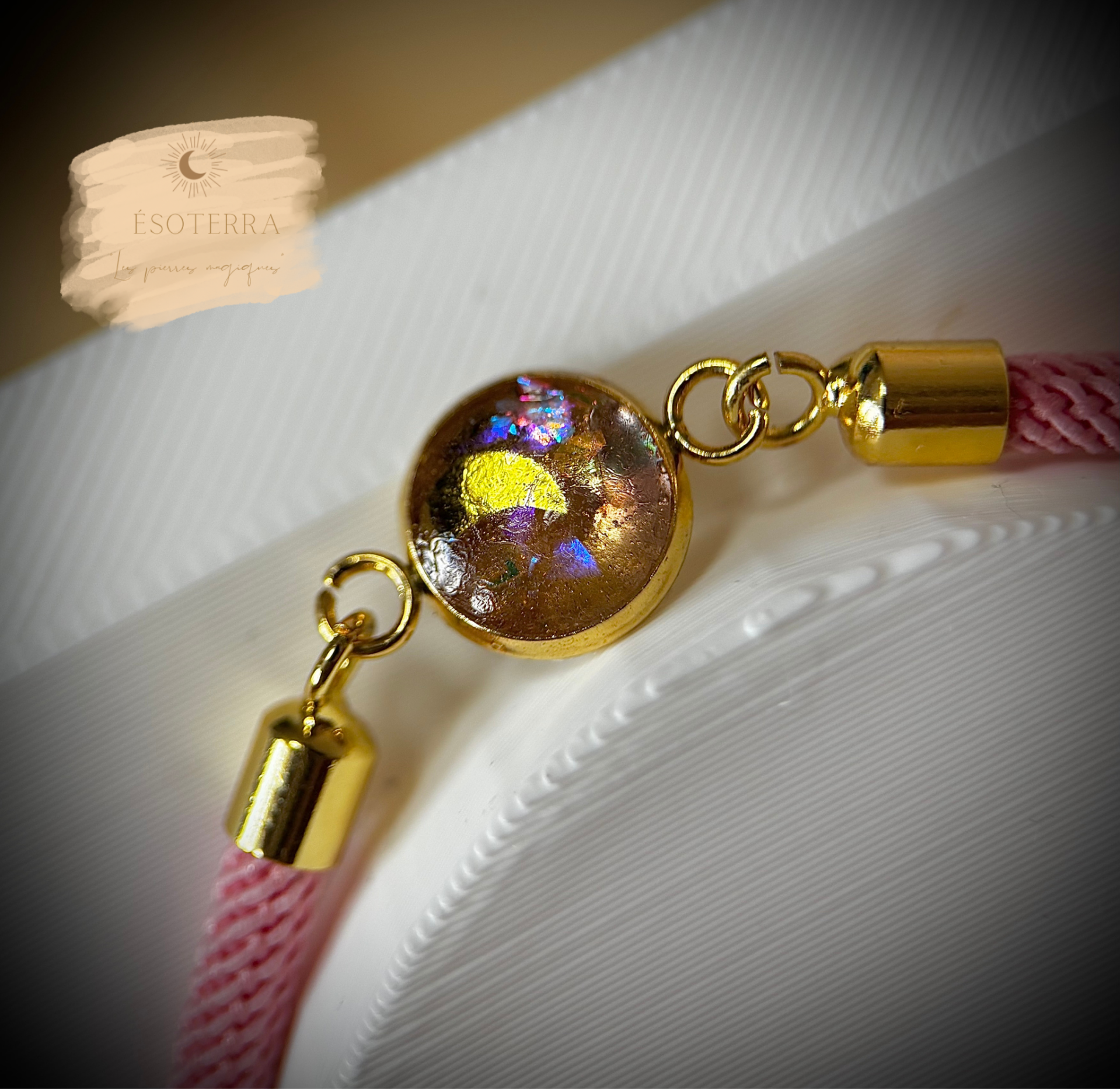 Bracelet fait main en résine époxy couleur Dorée en Acier inoxydable avec cordon rose clair ( taille réglable ).