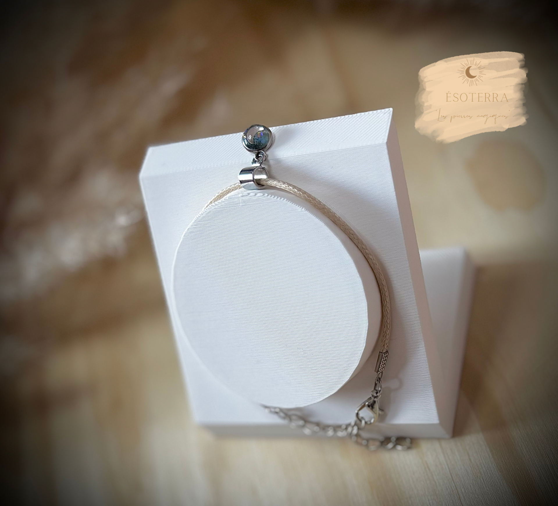 Bracelet fait main en résine époxy couleur Argenté en Acier inoxydable avec cordon synthétique beige ( taille réglable ).