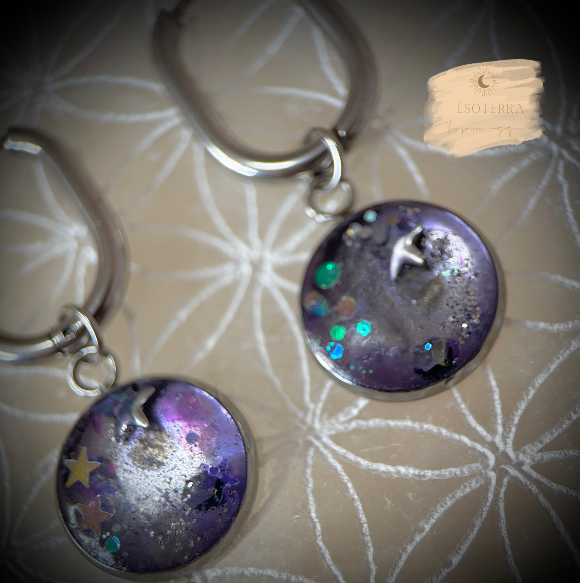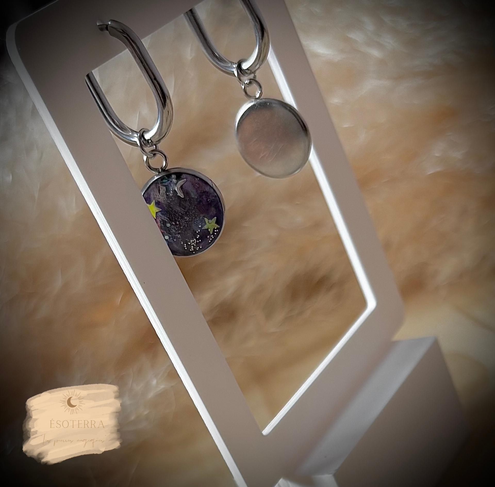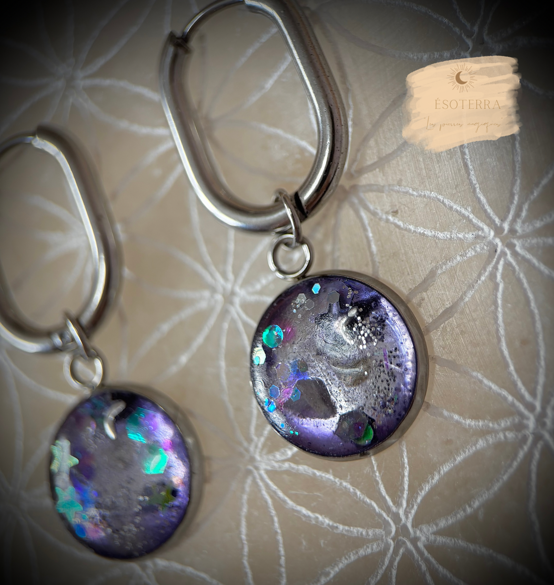 Boucles d'oreilles fait main en résine Epoxy avec créoles couleur Argentée en Acier inoxydable.