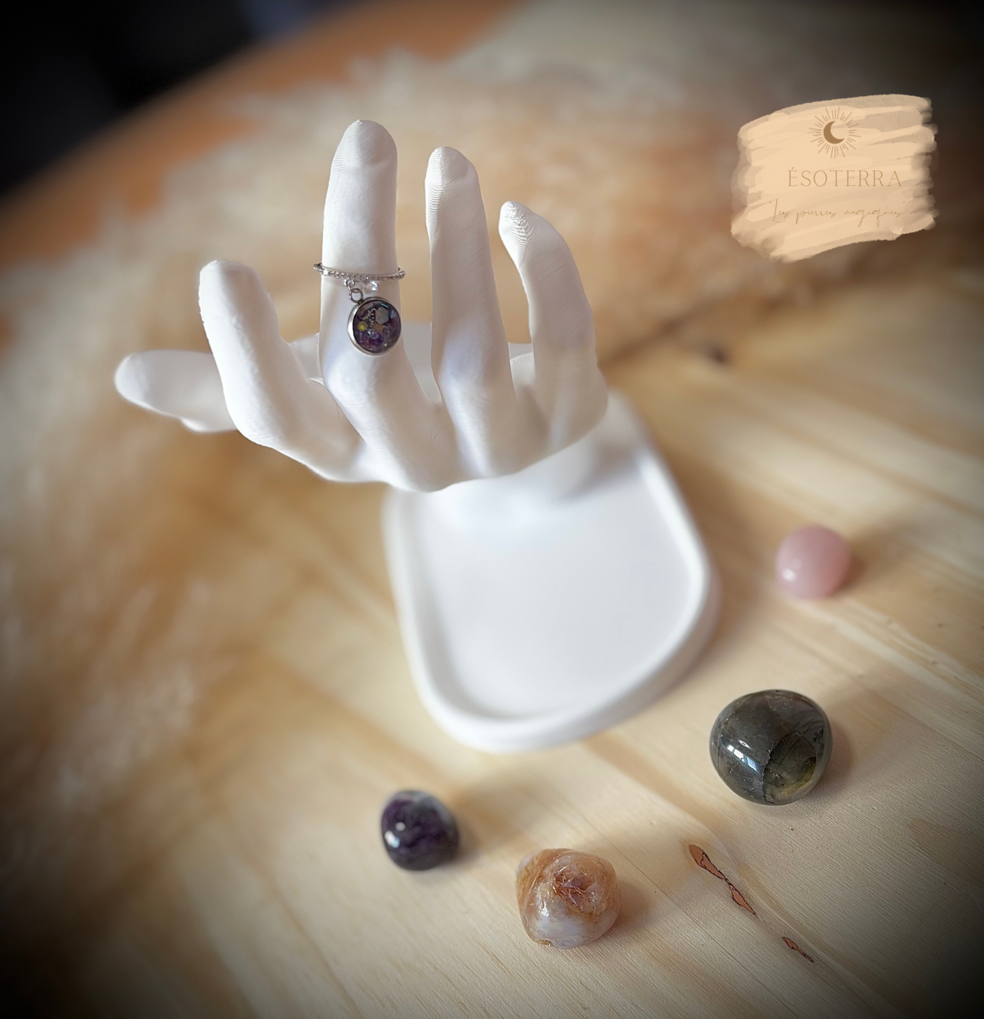 Bague non-reglable ( Taille unique ) fait main en résine Epoxy couleur Argentée avec Strass en Acier inoxydable.